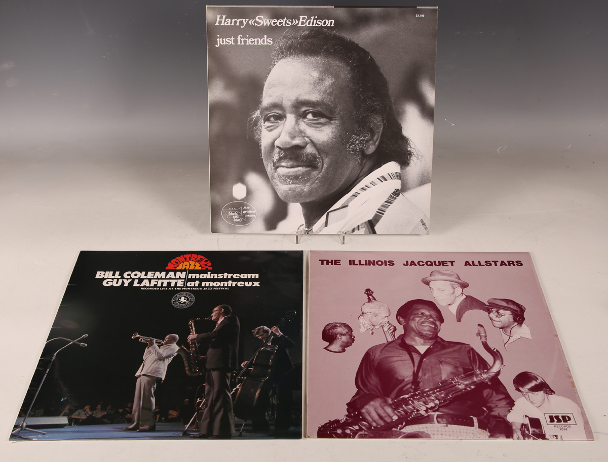A collection of approximately forty-six jazz LP records, including albums by Ben Webster, Oscar Peterson, Al Grey, Jimmy Forrest, Bill Coleman and Bennie Green, also including four signed records, comprising 'Just Friends' by Harry 'Sweets' Edison, 'Illinois Jacquet with Milt and Jo', signed by Jacquet, 'The Illinois Jacquet Allstars', signed by Slam Stewart, and 'Mainstream at Montreux', signed by Guy Lafitte.