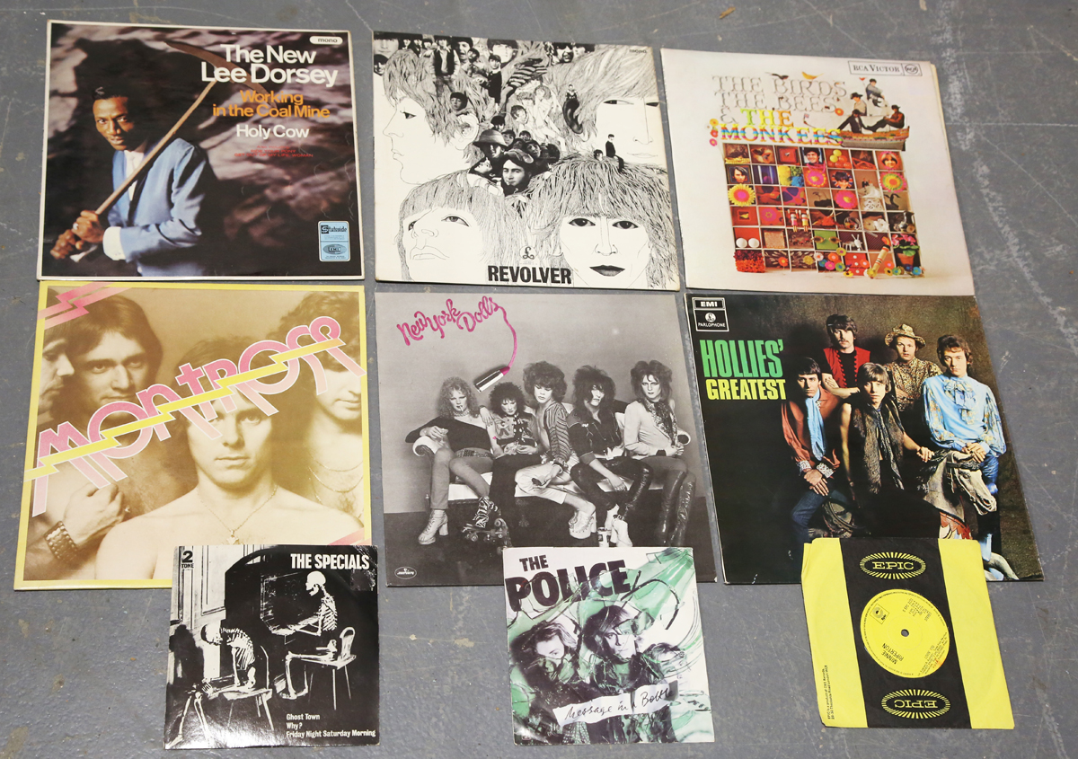 A collection of seventeen LP records, including the New York Dolls eponymous first album, a mono early pressing of 'Revolver' by The Beatles, and albums by The Monkees and Montrose, together with a small quality of singles.