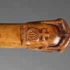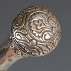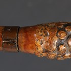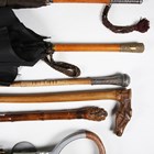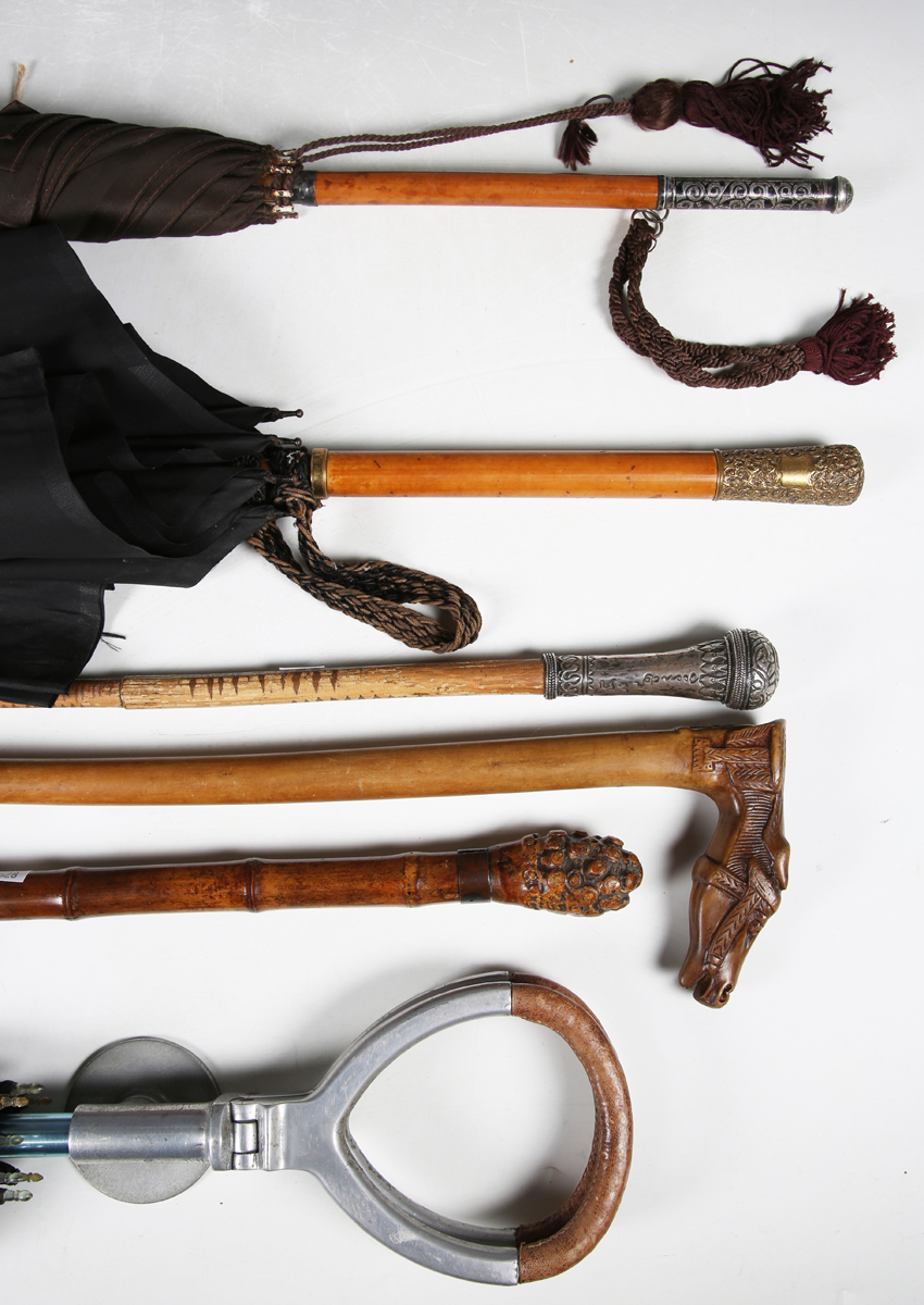 A group of mainly late 19th and early 20th century walking sticks and umbrellas, one fitted with an internal measuring stick, another with carved horse head handle, length 91cm.