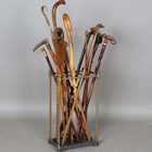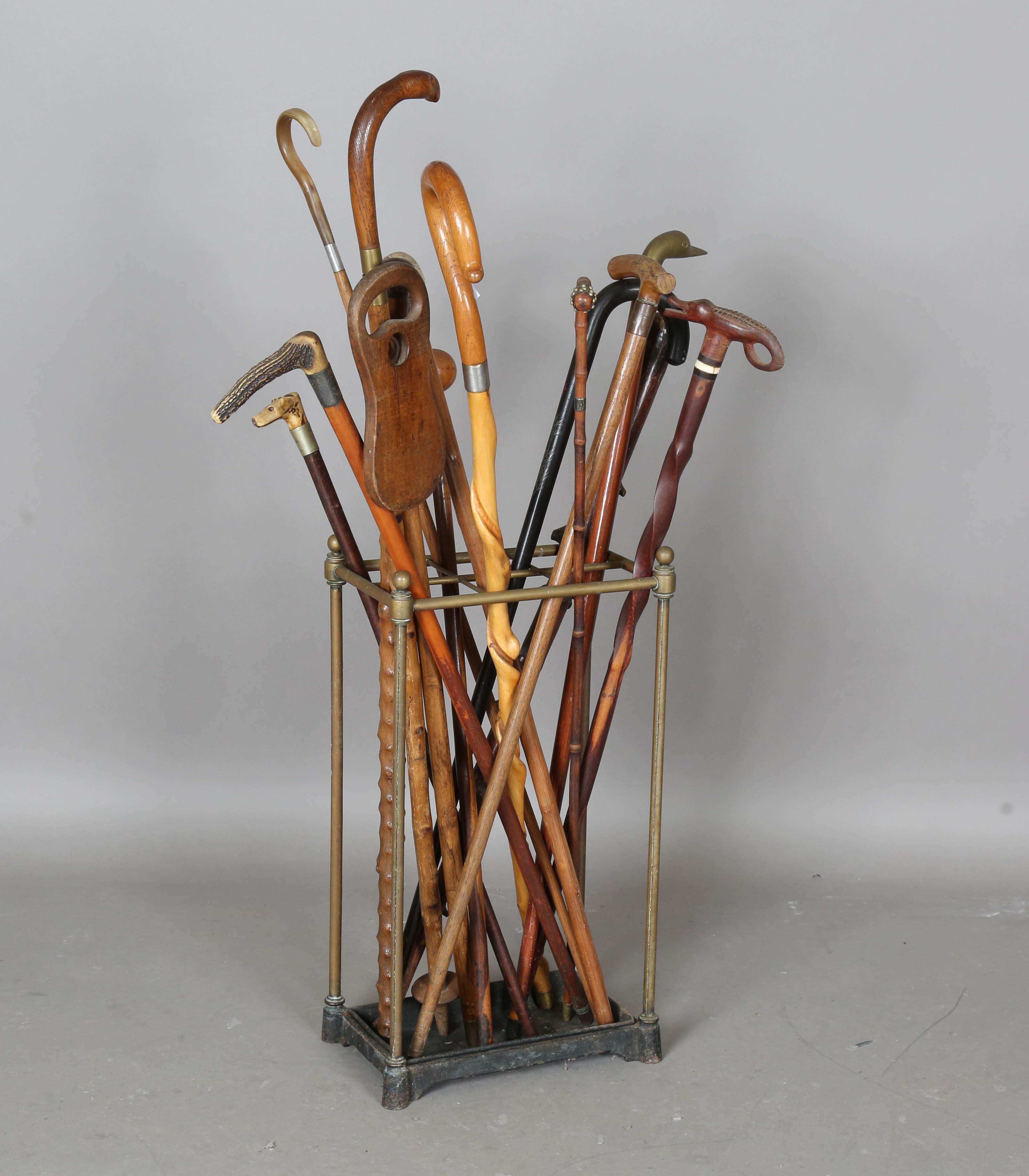 An Edwardian brass stickstand, height 59cm, width 33cm, together with a collection of various walking sticks, including a carved oak parrot head walking stick, length 108cm, and an African knobkerrie.