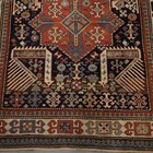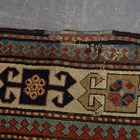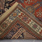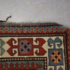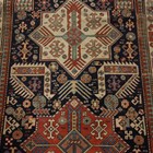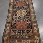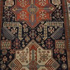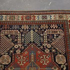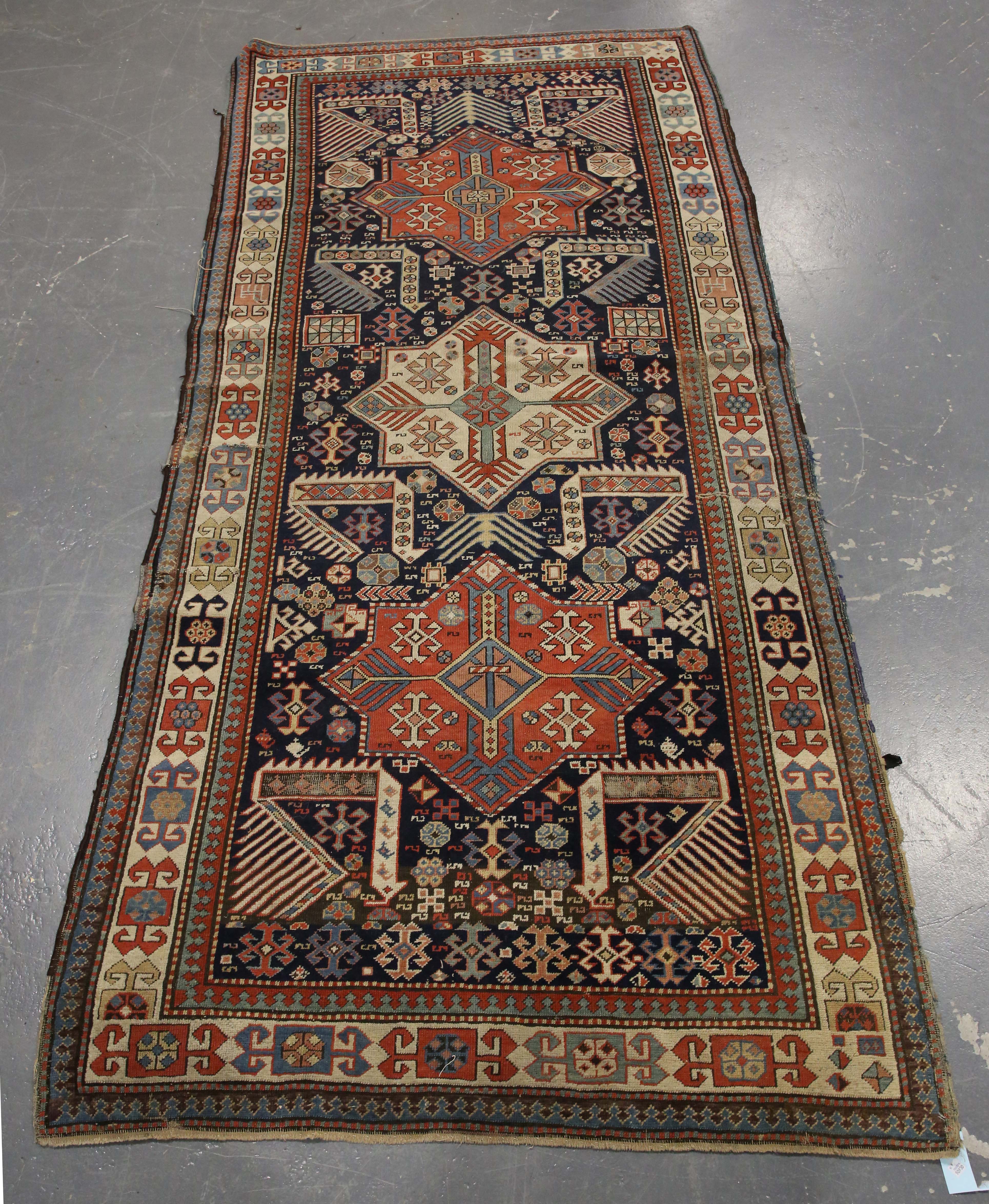 A Shirvan Akstafa rug, East Caucasus, early 20th century, the midnight blue field with three bold medallions, supported by stylized birds and guls, within an ivory hooked gul border, 275cm x 119cm.