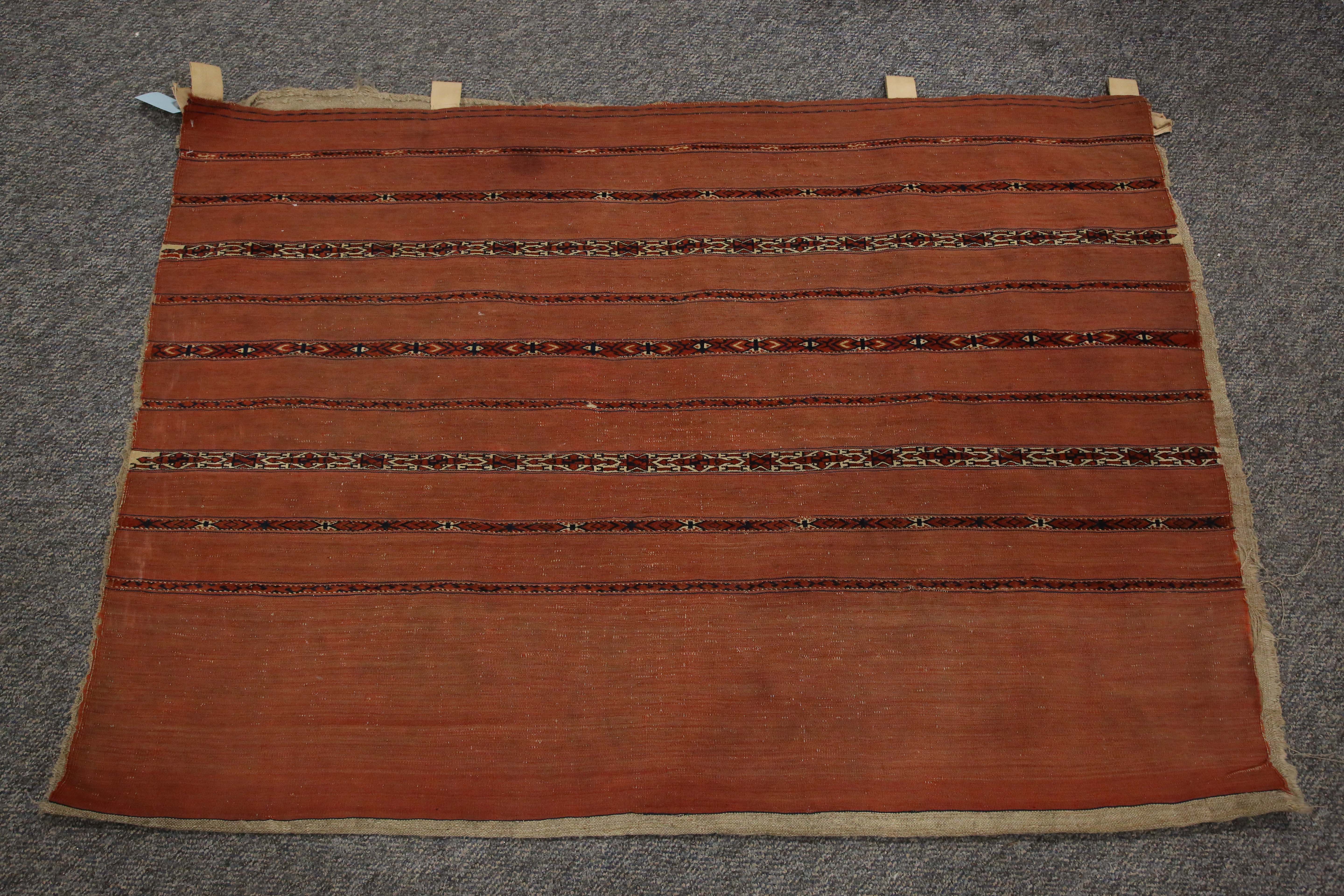 A fine Turkestan tent bag, late 19th/early 20th century, the flatweave panel worked with horizontal piled stripes, 124cm x 90cm.