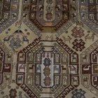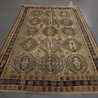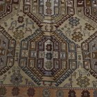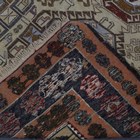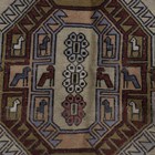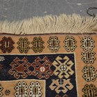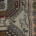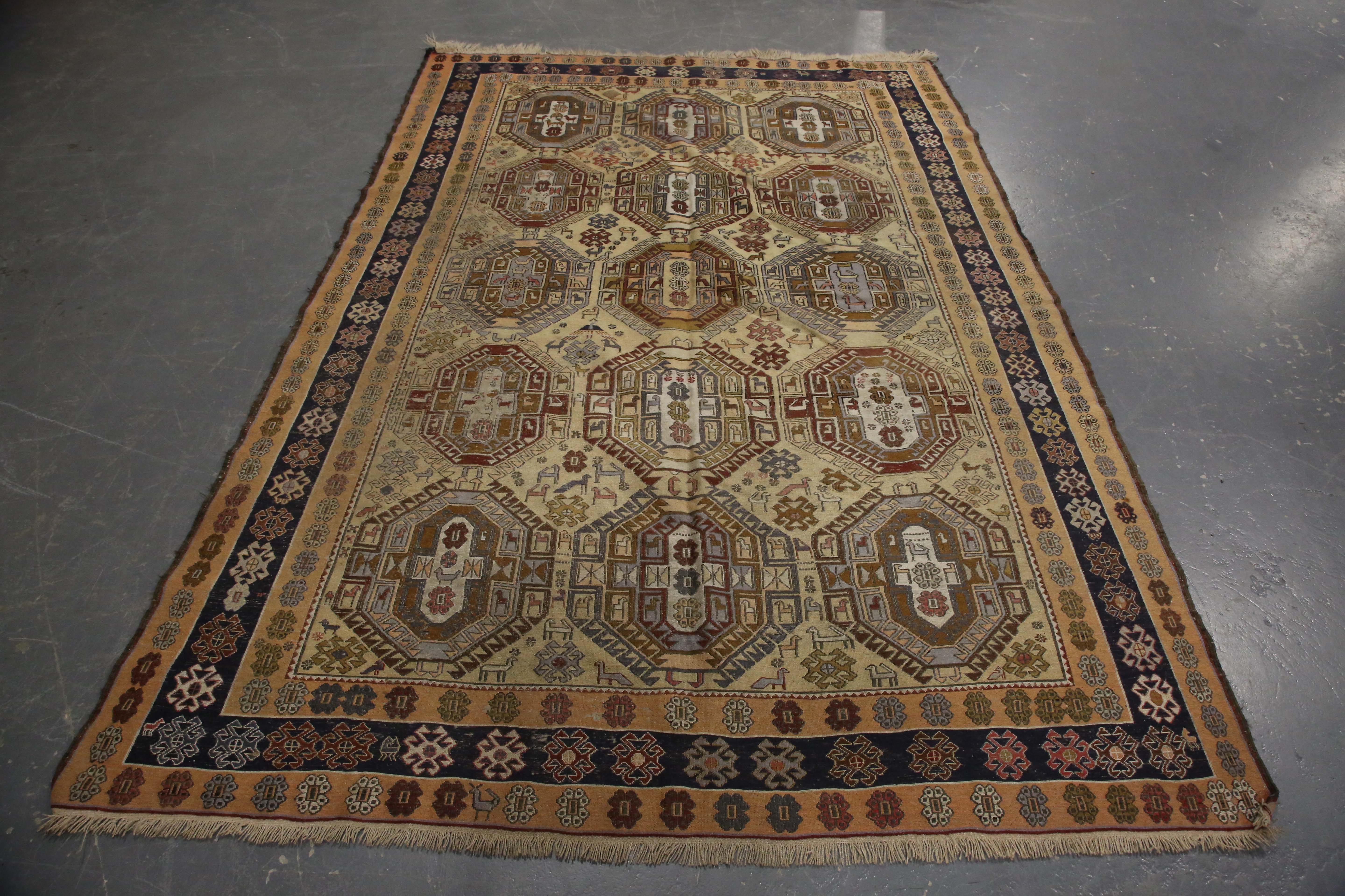 An Azari soumak flatweave carpet, mid-20th century, the ivory field with three columns of bold guls, supported by animals, within a dark blue hooked gul border, 278cm x 191cm.