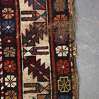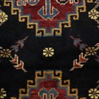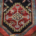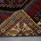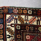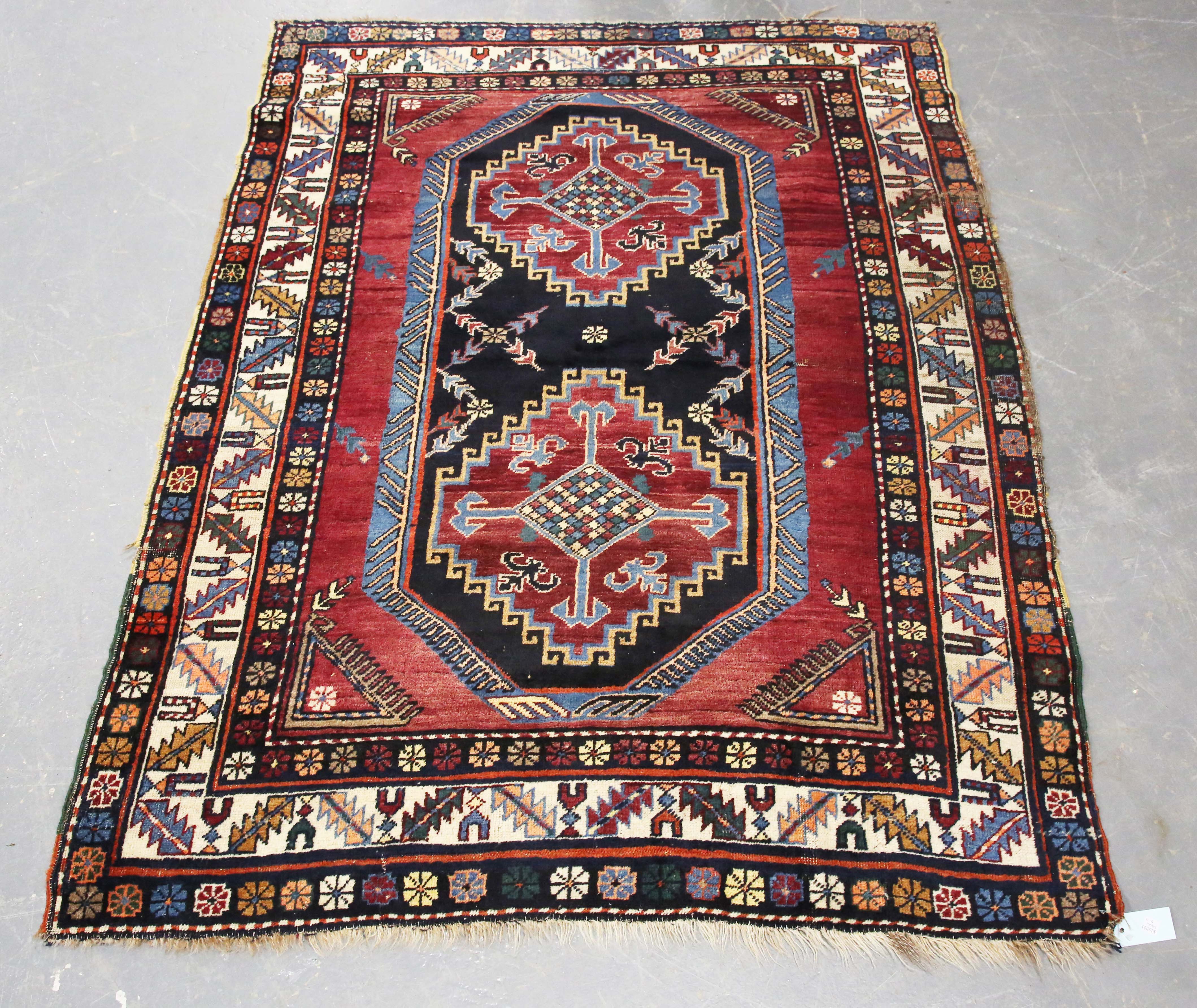 A Caucasian rug, early/mid 20th century, the deep claret field with a charcoal reserve enclosing two stepped medallions, within an ivory serrated leaf border, 170cm x 128cm.