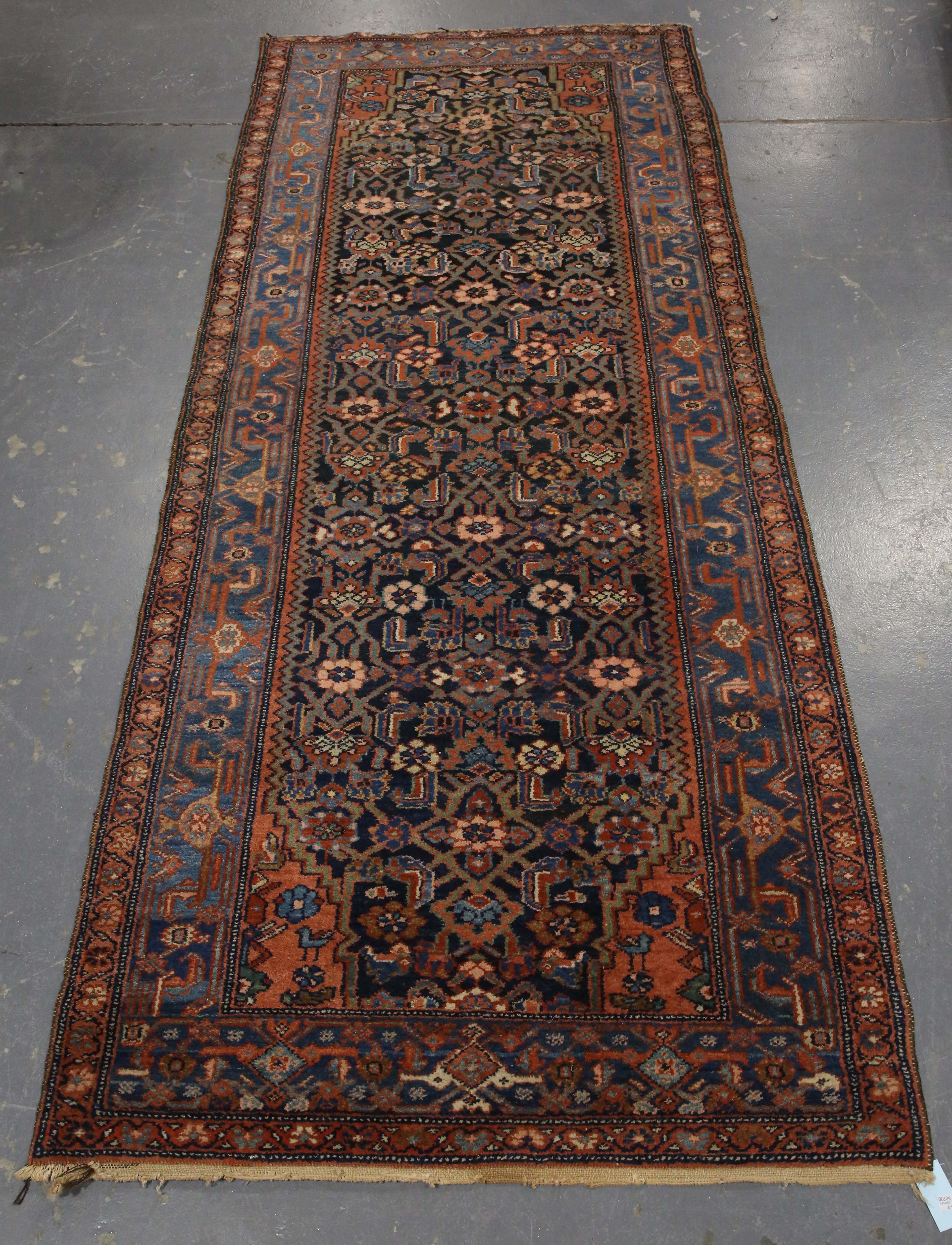 A Hamadan runner, North-west Persia, early 20th century, the midnight blue field with an overall floral lattice, within a complimentary border, 265cm x 107cm.