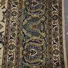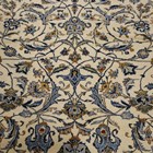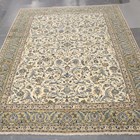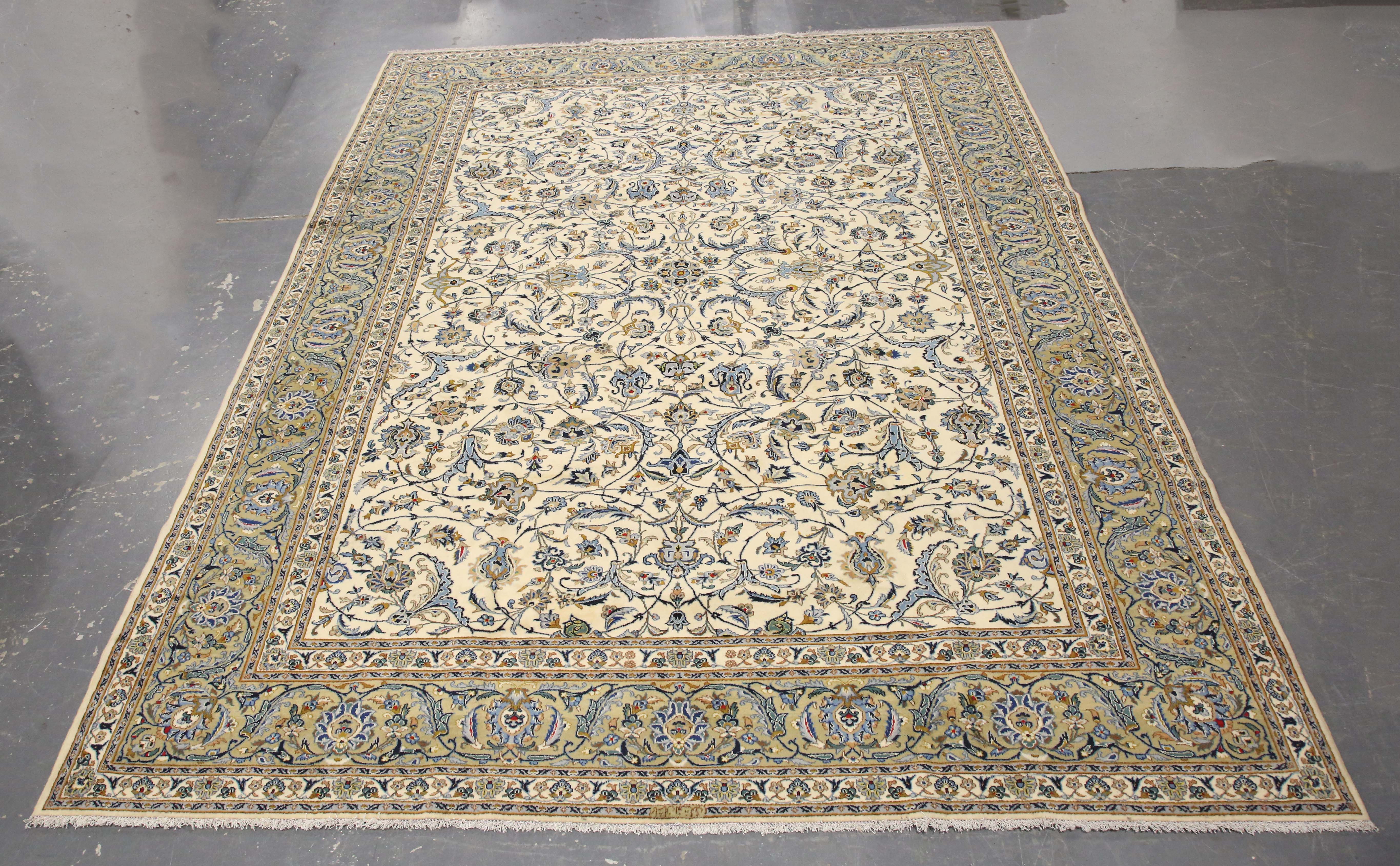 A signed Kashan carpet, Central Persia, late 20th century, the ivory field with overall scrolling tendrils issuing palmettes and leaves, within a pale green complimentary border, 365cm x 274cm.