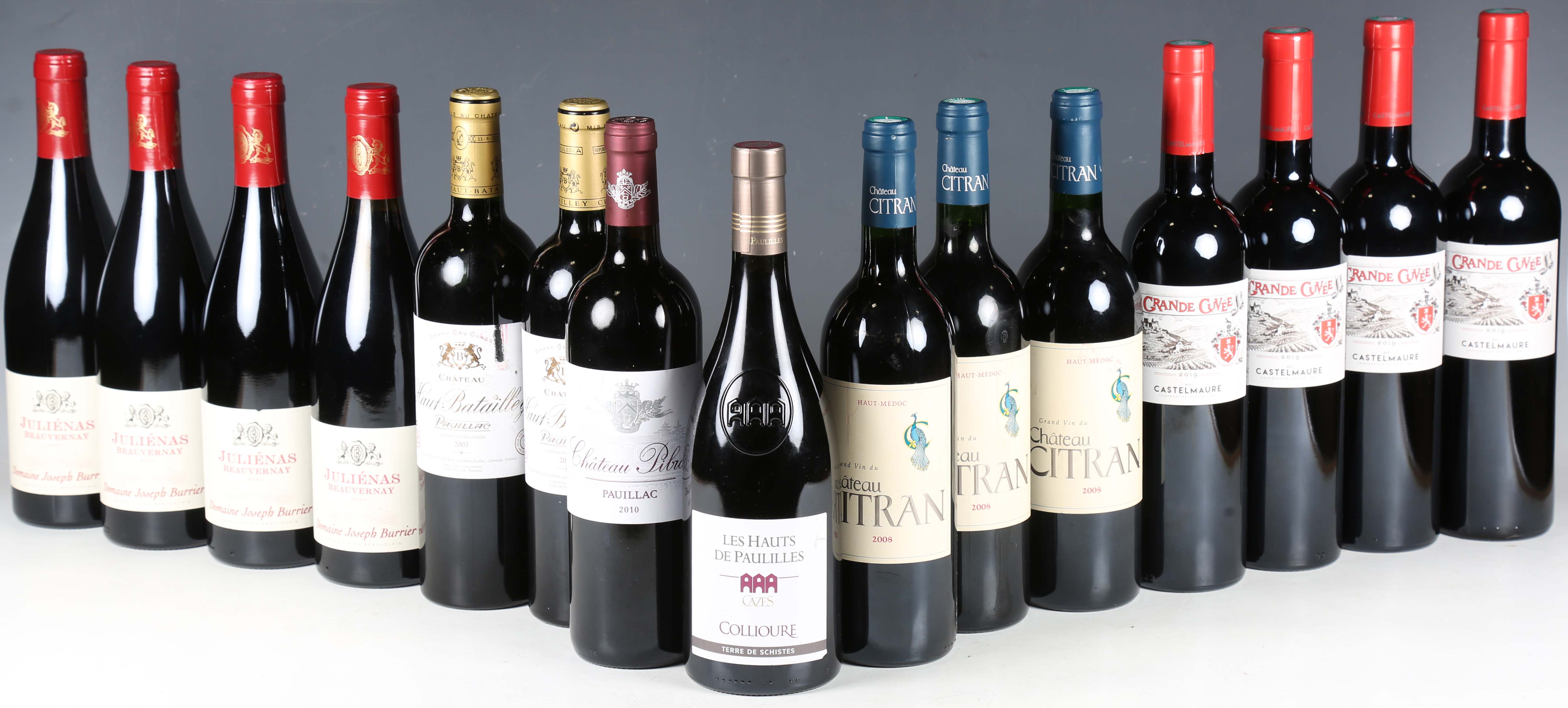 Domaine Joseph Burrier Juliénas Beauvernay, 2020 (4), Castelmaure Grande Cuvée, 2019 (4), Grand Vin du Château Citran, 2008 (3), Château Haut Batailley Pauillac, 2003 (2), Château Pibran Pauillac, 2010 (1), Cazes Les Hauts de Paulilles (1).