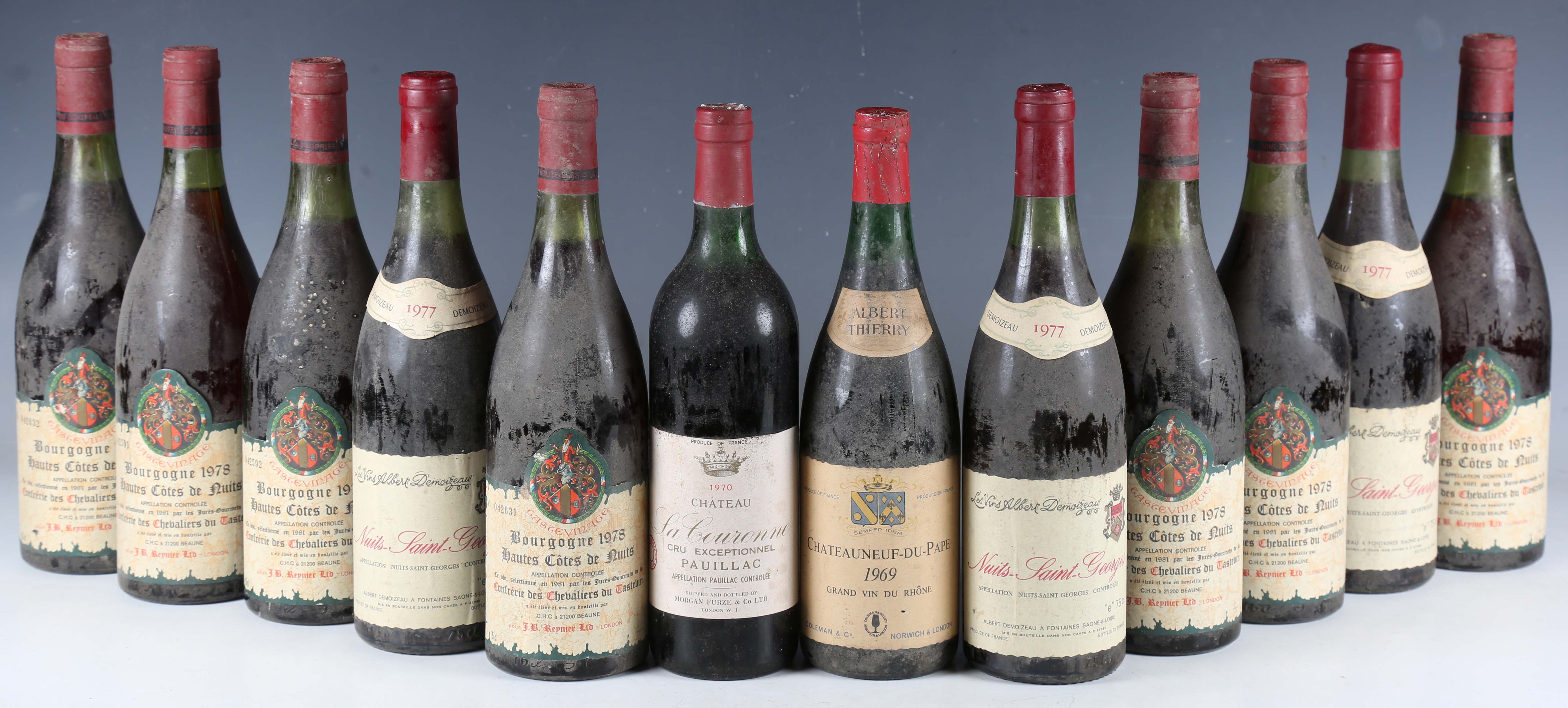 Hautes Côtes de Nuits Bourgogne Tastevinage, 1978 (7), Albert Demoizeau Nuits-Saint-Georges, 1977 (3), Albert Thierry Châteauneuf-du-Pape, 1969 (1), Château La Couronne Cru Exceptionnel Pauillac, 1970 (1).