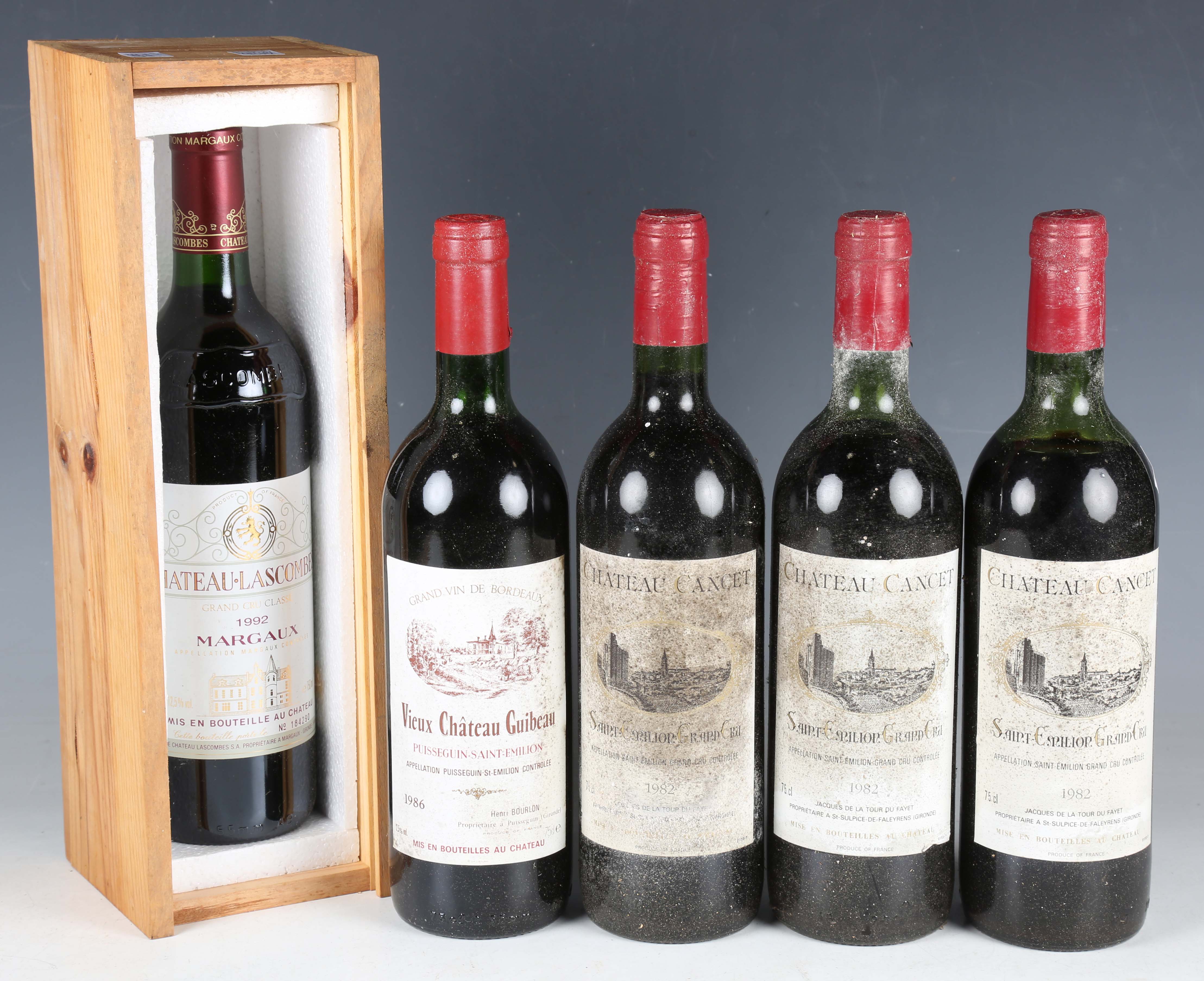 Château Lascombe Margaux Grand Cru Classé, 1992 (1), Château Cancet Saint-Emilion Grand Cru, 1982 (3), Vieux Château Guibeau Puisseguin-Saint-Emilion, 1986 (1).