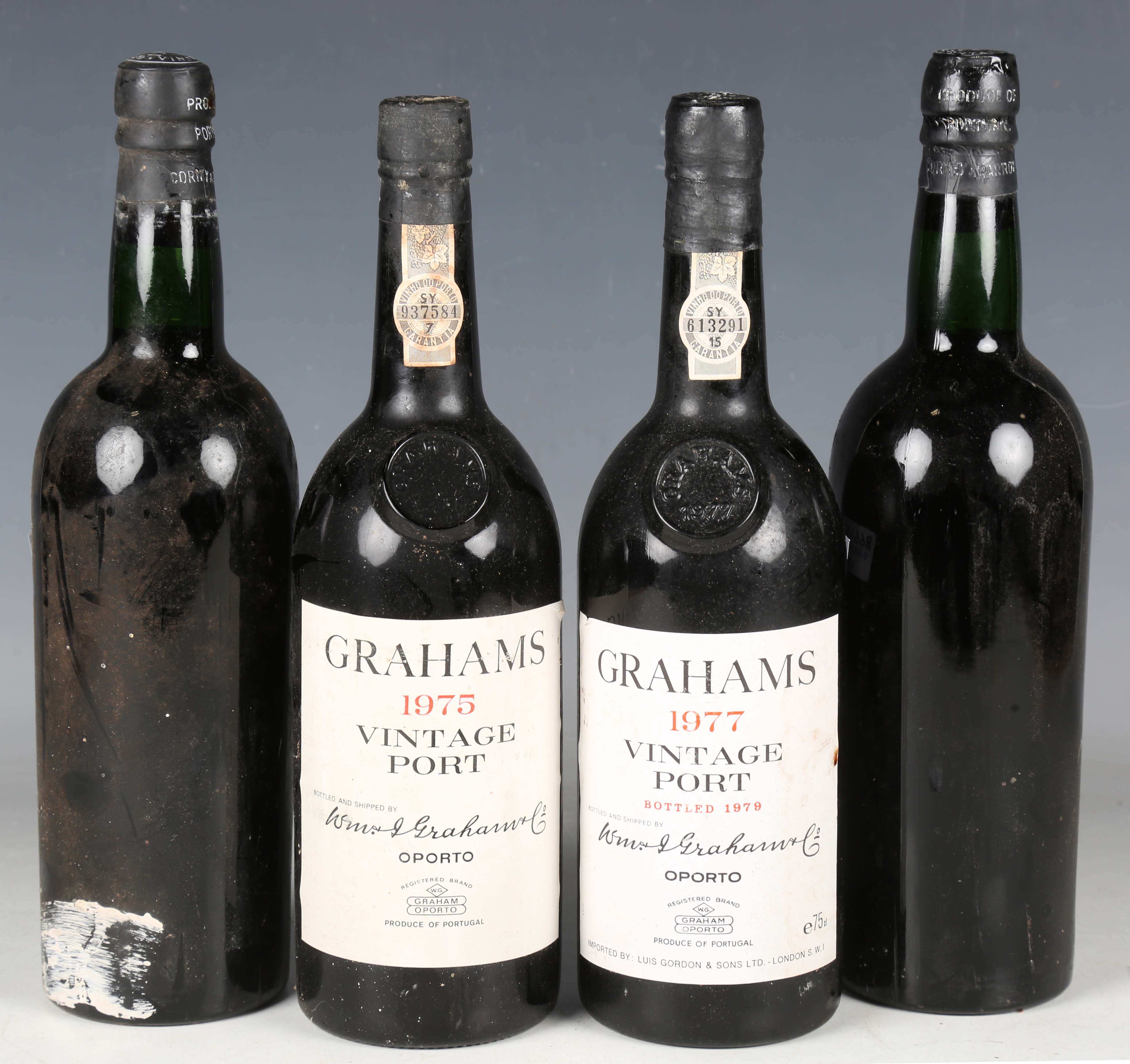 Grahams Vintage Port, 1963 (2) (lacking labels), Grahams Vintage Port, 1975 (1) and 1977 (1).