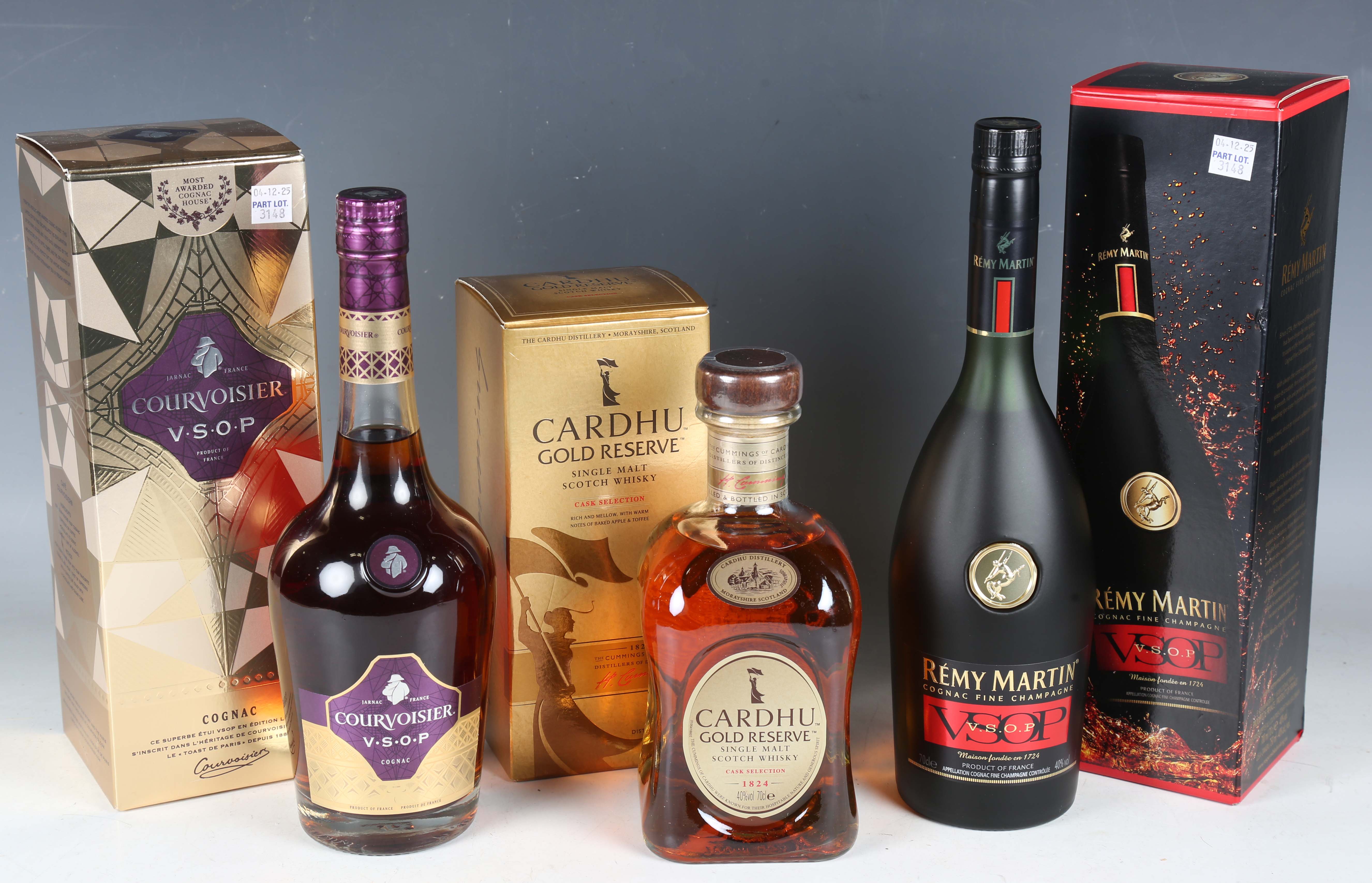 Cardhu Gold Reserve Single Malt Scotch Whisky, boxed (1), Courvoisier V.S.O.P Cognac, boxed (1), Rémy Martin V.S.O.P Fine Champagne Cognac, boxed (1).
