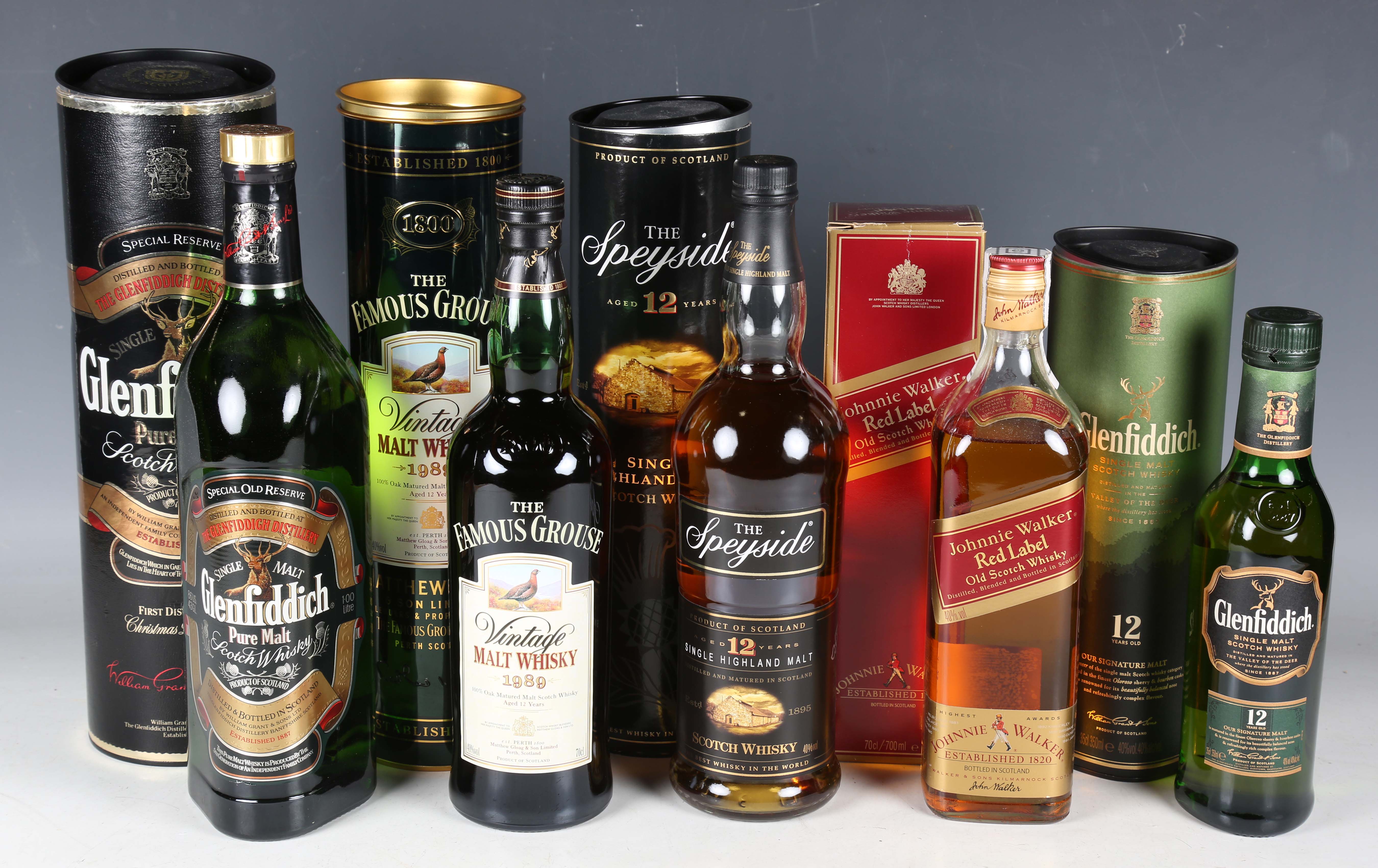 The Speyside Single Highland Malt Scotch Whisky, Aged 12 Years, with tube (1), Glenfiddich Single Malt Special Old Reserve Scotch Whisky, 1 litre, with tube (1), Glenfiddich Single Malt Scotch Whisky, 12 Years Old, 35cl, with tube (1), Famous Grouse Vintage Malt Whisky, with tube (1), Johnnie Walker Red Label Old Scotch Whisky, boxed (1).