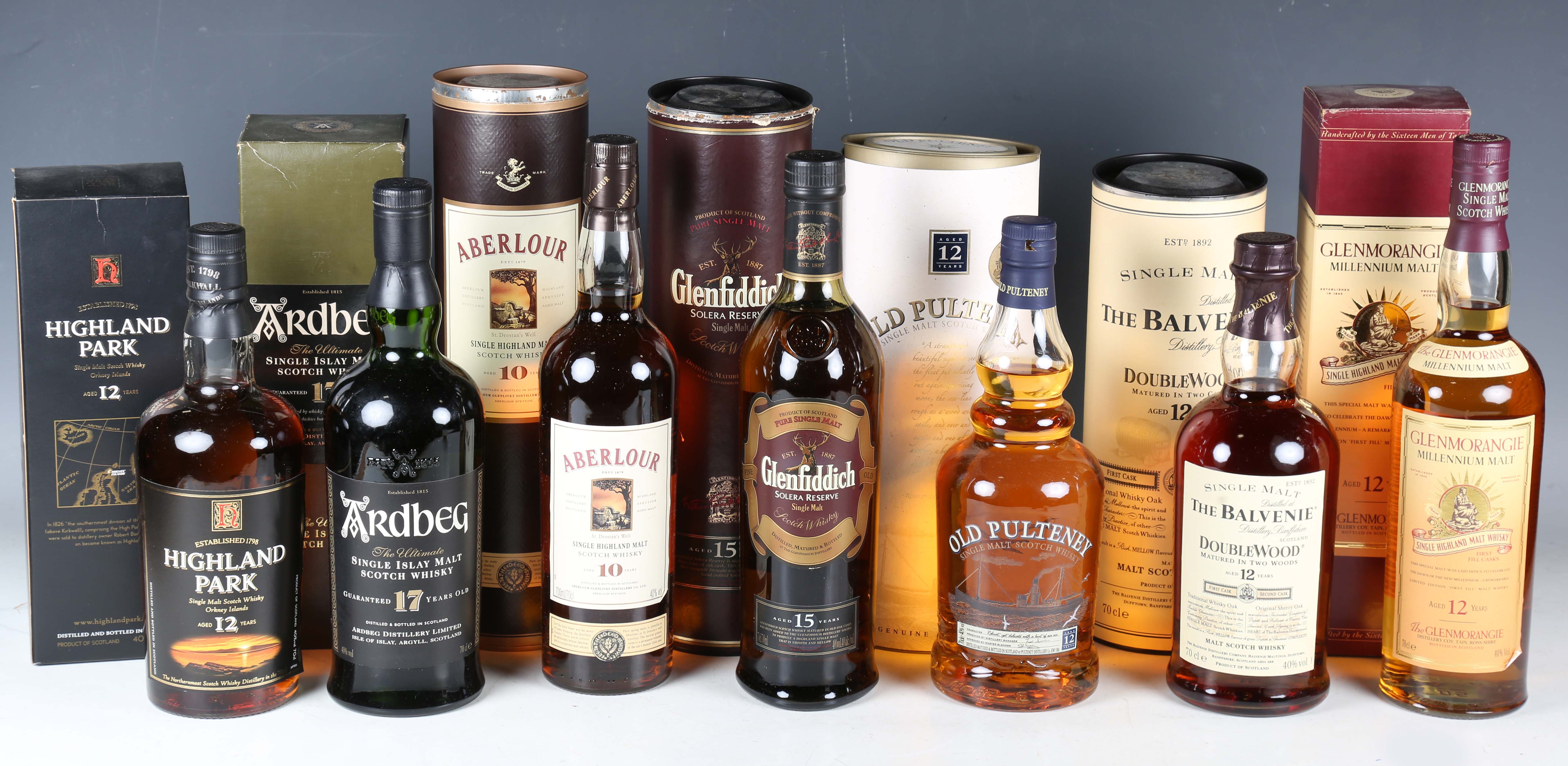 The Balvenie DoubleWood Single Malt Scotch Whisky, Aged 12 Years, with tube (1), Old Putney Single Malt Scotch Whisky, Aged 12 Years, boxed (1), Ardbeg Single Islay Malt Scotch Whisky, 17 Years Old, boxed (1), Highland Park Single Malt Scotch Whisky, Aged 12 Years, boxed (1), Aberlour Single Highland Malt Scotch Whisky, Aged 10 Years, with tube (1), Glenfiddich Solera Reserve Single Malt Scotch Whisky, with tube (1), Glenmorangie Single Highland Malt Whisky, Aged 12 Years, boxed (1).