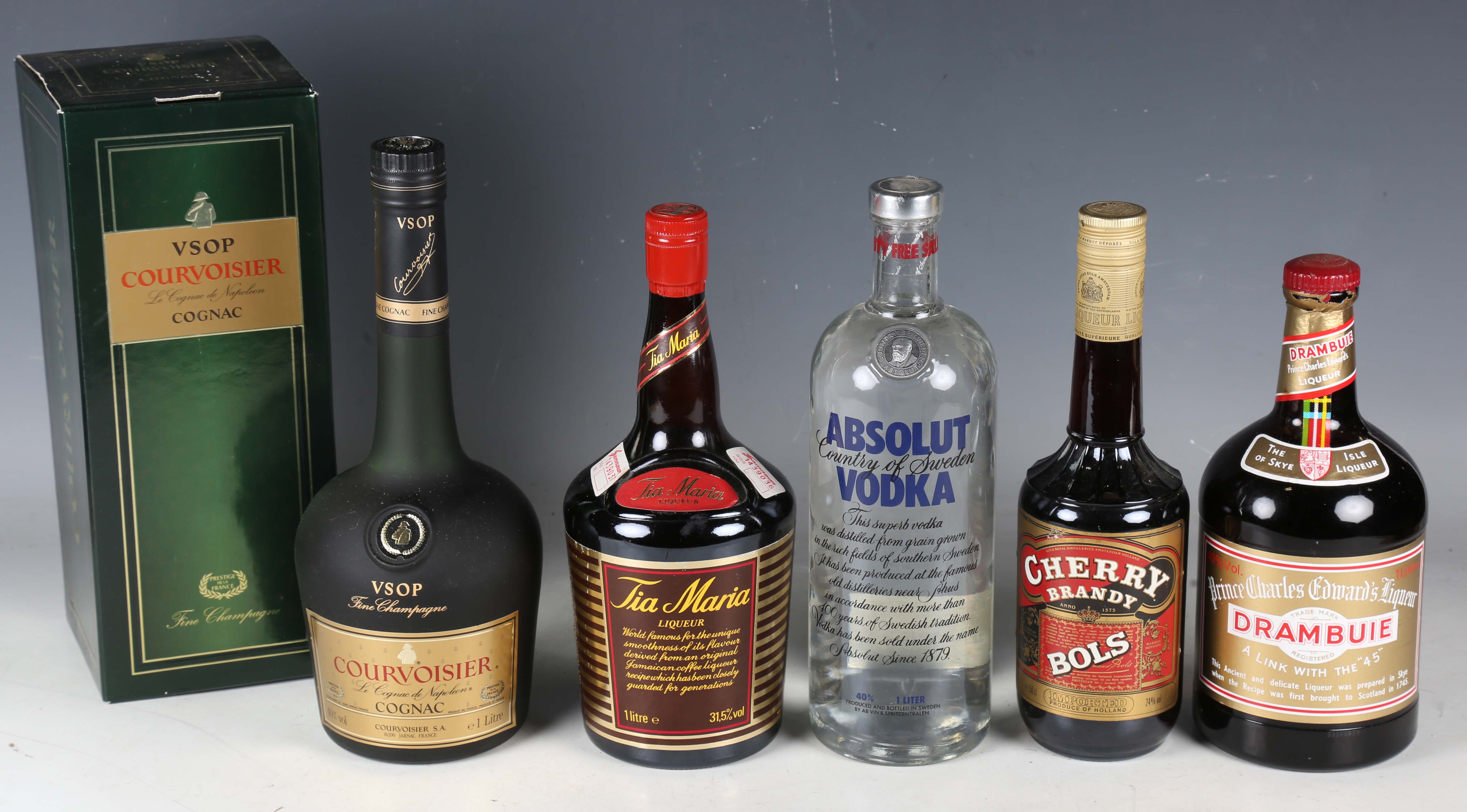 Courvoisier V.S.O.P Cognac, 1 litre, boxed (1), Drambuie, 1 litre (1), Tia Maria Liqueur, 1 litre (1), Bolls Cherry Brandy, 50cl (1), Absolut Vodka, 1 litre (1).