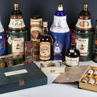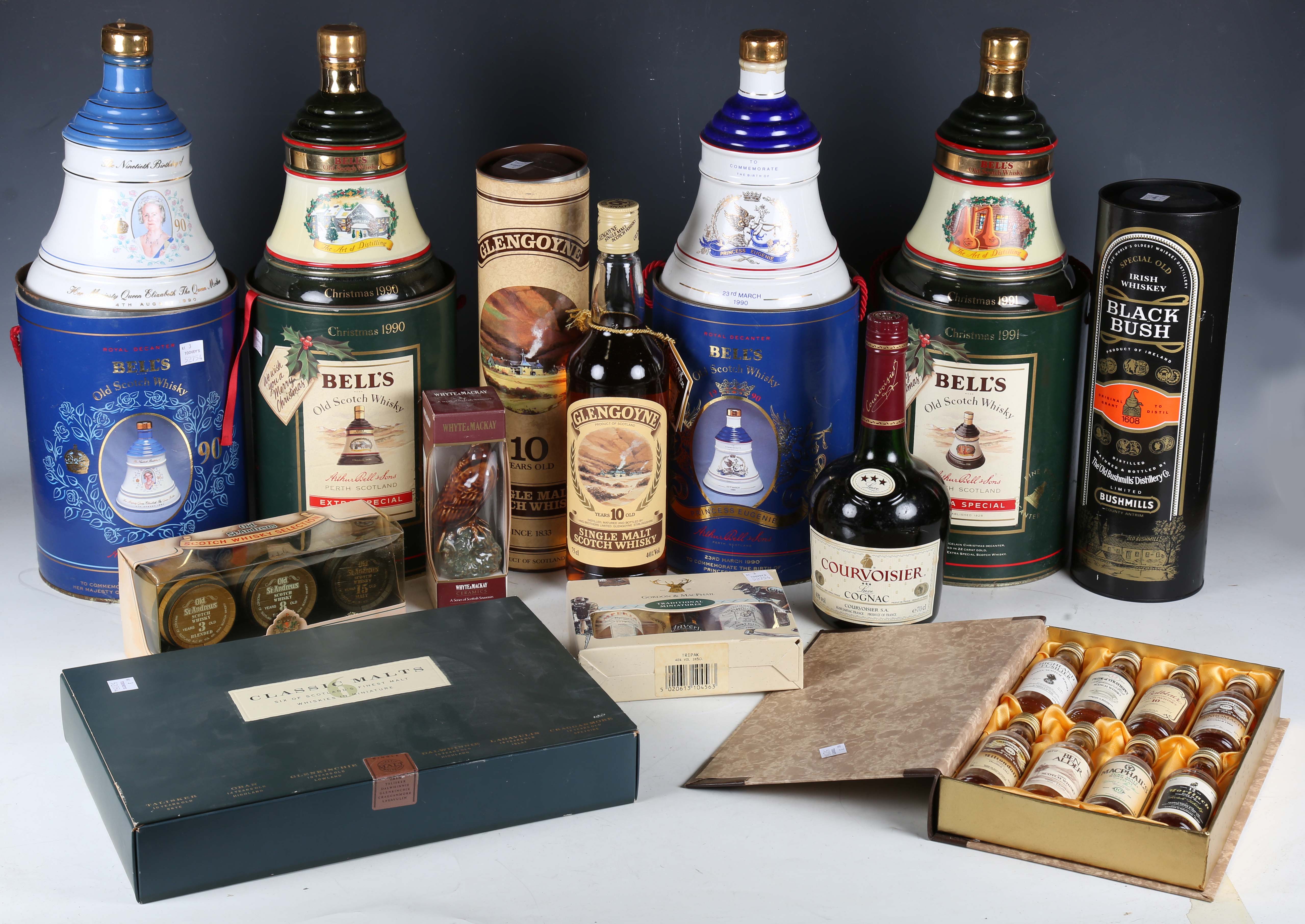 Bushmills Black Bush Special Old Irish Whiskey, 1 litre, with tube (1), Glengoyne Single Malt Scotch Whisky, 10 Years Old, with tube (1), Bell's Old Scotch Whisky in Wade porcelain decanters, with tubes (4), Courvoisier Luxe Cognac (1), and a group of various whisky miniatures, all boxed.