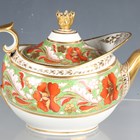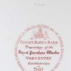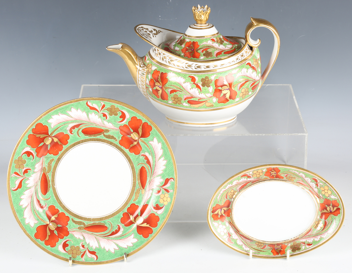 A Barr, Flight & Barr Worcester teapot, cover and stand, early 19th century, of oval shape with flame finial, painted and gilt with flowers and foliage against a dotted green ground, length of stand 19.5cm, with a matching plate, diameter 23.8cm, impressed and printed marks (finial glued). Provenance: The Flight Collection.