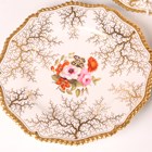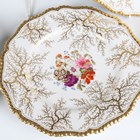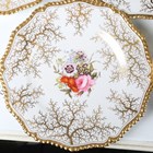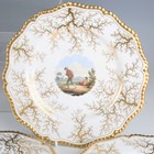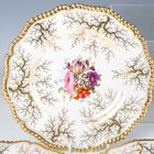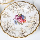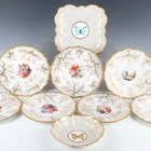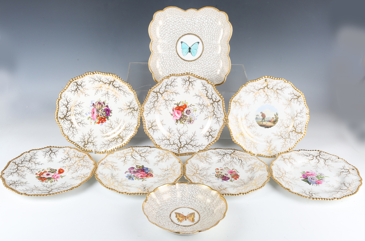 A matched set of six Flight, Barr & Barr Worcester botanical dessert plates, early 19th century, each painted with a central floral arrangement within gilt weed framing and a gilt gadrooned rim, various impressed and printed marks to bases, average diameter 22.8cm, a matching plate painted to the centre with two peasant figures, diameter 22cm, and a Barr, Flight & Barr Worcester square dish and single handled circular dish both later painted with a central butterfly against a gilt vermicular ground, impressed marks to bases. Provenance: The Flight Collection.