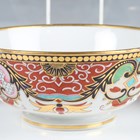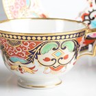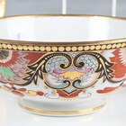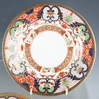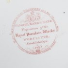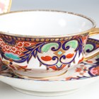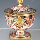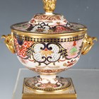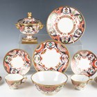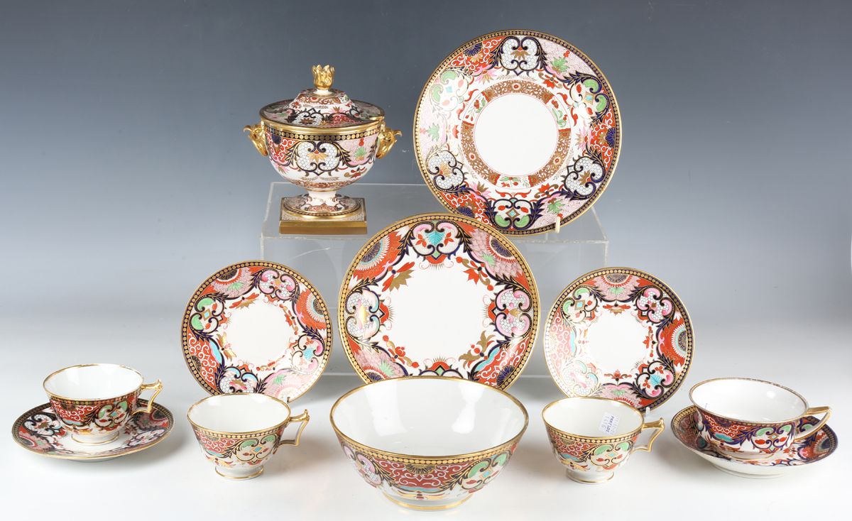 A Barr, Flight & Barr Worcester sauce tureen and cover, early 19th century, richly painted and gilt in a Japan pattern with spiral, scroll and oeil-de-perdrix panels within foliate framing and patterned borders, flanked by gilt bird head and ring handles, the cover with flame finial, raised on a square base, impressed marks, height 16cm, together with a small group of teawares painted and gilt in the same pattern, comprising three cups and saucers, a breakfast cup and saucer, circular bowl, diameter 17.3cm, a saucer dish, diameter, 20cm, and a plate, diameter 21.5cm, impressed marks (minor faults and restoration). Provenance: The Flight Collection.