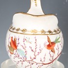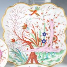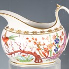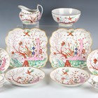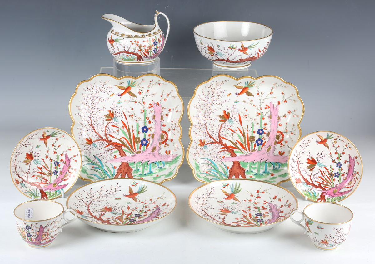 A group of Barr, Flight & Barr Worcester wares, early 19th century, painted and gilt in chinoiserie style with birds in branches by prunus blossom beside a large pink tree trunk, comprising a pair of square dishes with shaped rims, length 23cm, a pair of saucer dishes, 20cm diameter, slop bowl, 17cm diameter, jug, two teacups with ring handles and two saucers, impressed and printed marks to bases (minor faults). Provenance: The Flight Collection.