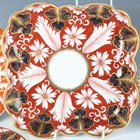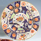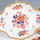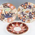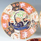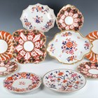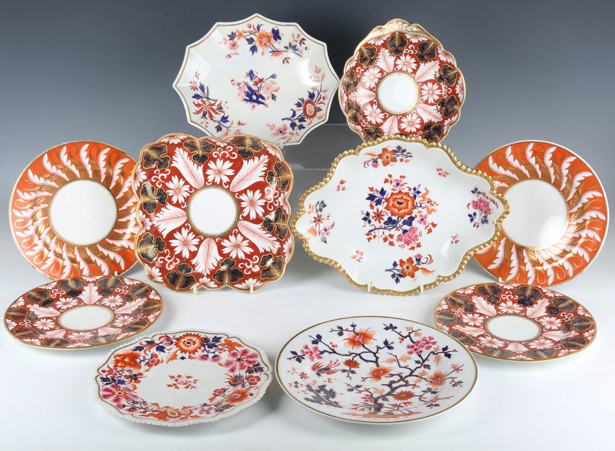 A small group of mostly Flight, Barr & Barr Worcester, early 19th century, painted and gilt primarily in Japan colours, including a square shaped dish, two plates and a matching single handled circular dish with large blue leaves against an iron red ground, square dish 22.2cm long, a plate with gadrooned rim, diameter 22cm, a similar oval dish, length 30.5cm, two plates with white and gilt leaves against an orange ground, diameter 21cm, and a plate with chinoiserie tree and bird, diameter 24cm, various impressed and printed marks (restoration). Provenance: The Flight Collection.
