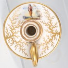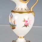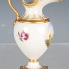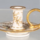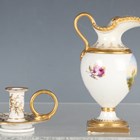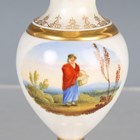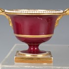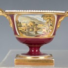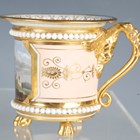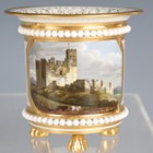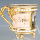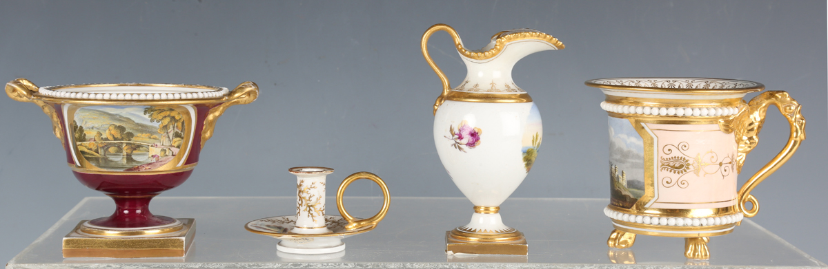 A Flight, Barr & Barr Worcester rosewater sprinkler, early 19th century, the ovoid body painted with a Pyne style peasant figure opposing scattered flowers, the covered spout gilt with foliate scrollwork and pierced with four holes, with high loop handle and circular foot on a square base, puce painted marks to base, height 10cm, together with three other pieces of Flight & Barr Worcester, comprising a miniature taperstick painted with a peasant figure and gilt with weed, height 3.8cm, a cabinet cup raised on three gilt paw feet painted with a titled view of Bothall (sic) Castle, Northumberland, between white beaded borders, height 7.5cm, and a claret ground pastille burner base, painted with a titled view of Beddgellert (sic) Bridge, N. Wales, height 7.5cm (faults and restoration throughout). Provenance: The Flight Collection.