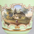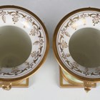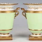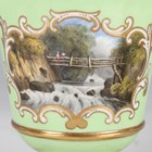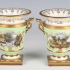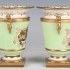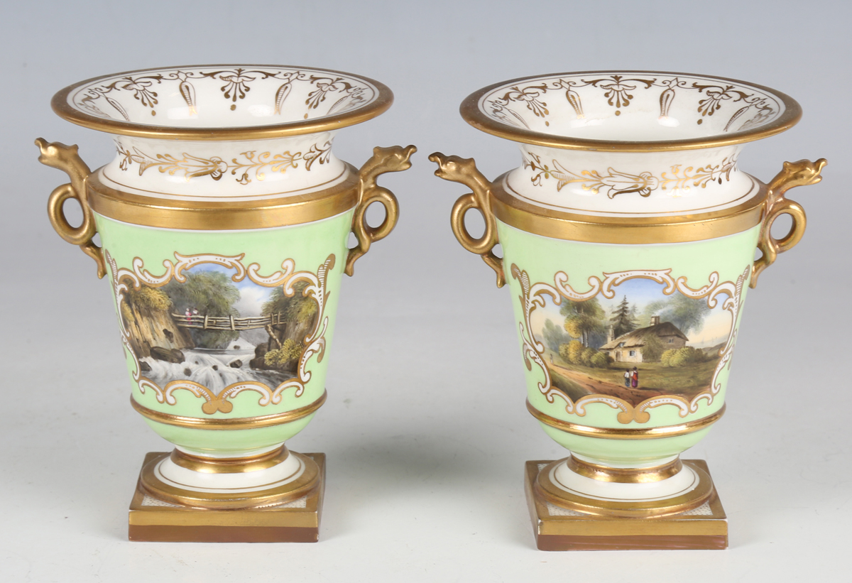A pair of Flight, Barr & Barr Worcester two-handled vases, circa 1815-20, of gently flared cylindrical shape with gilt snake handles, painted with titled scenes ‘Near Dolgelly Merionethshire’ and ‘Binstead Cottage, Isle of Wight’, within gilt scroll frames against a pale green ground, raised on square bases, impressed and red script marks to bases, height 10.5cm (some restoration).