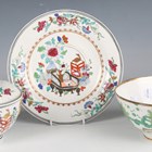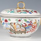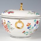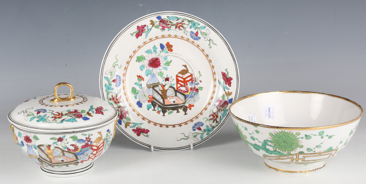 A Barr, Flight & Barr Worcester écuelle, cover and stand, early 19th century, painted and gilt in Chinese style with precious objects and flowers, the écuelle with moulded gilt enriched circular handles, the cover with gilt ring knop, impressed and puce printed marks to bases, diameter of stand 20.3cm, together with a slop bowl painted in gilt enriched green monochrome with a quail pattern, diameter 17.5cm (rim re-gilt). Provenance: The Flight Collection.