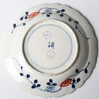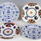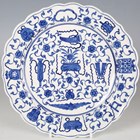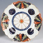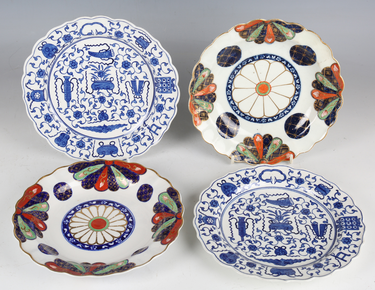 A pair of Worcester The Hundred Antiques pattern blue painted lobed dessert plates, 1770s, in Kangxi style painted with precious objects, blue painted Chinese style marks to bases, diameter 19.2cm, together with a Worcester Old Japan Fan pattern Imari painted plate, circa 1765, with scalloped rim, underglaze blue pseudo Chinese marks to base, diameter 19.3cm, and a matching Barr, Flight & Barr Worcester example (some restoration). Provenance: The Flight Collection.