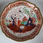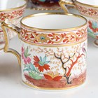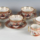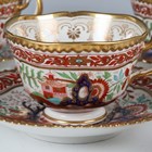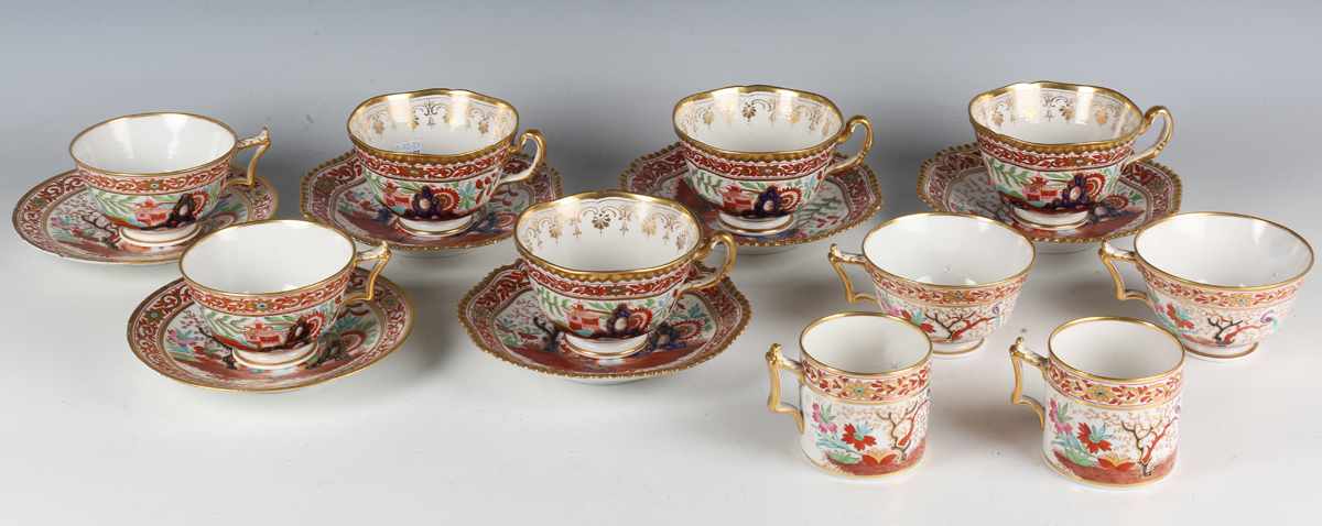 A set of four Flight, Barr & Barr Worcester teacups and saucers, early 19th century, each painted and gilt in a Japan pattern with a Chinese figure standing in a chinoiserie garden before a pavilion, within an iron red and gilt scrolling border and gilt gadrooned rim, some impressed marks, diameter of saucers 15.5cm, together with a small group of wares painted in the same pattern with plain gilt rims, comprising two trios and two extra teacups (minor faults). Provenance: The Flight Collection.