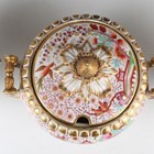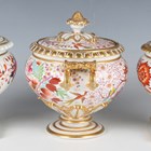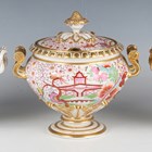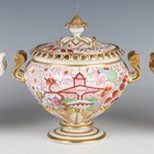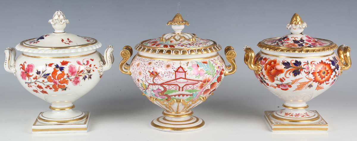 Three Flight, Barr & Barr Worcester sauce tureens and covers, early 19th century, each of circular bulbous shape, the first painted and gilt with a chinoiserie pink pavilion surrounded by birds in branches and flowers, flanked by scroll handles above gilt acanthus leaf moulding, the other two painted and gilt in Japan colours with flowers and foliage, impressed marks to bases, each 17cm high (faults and restoration). Provenance: The Flight Collection.