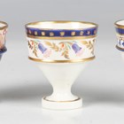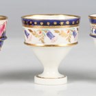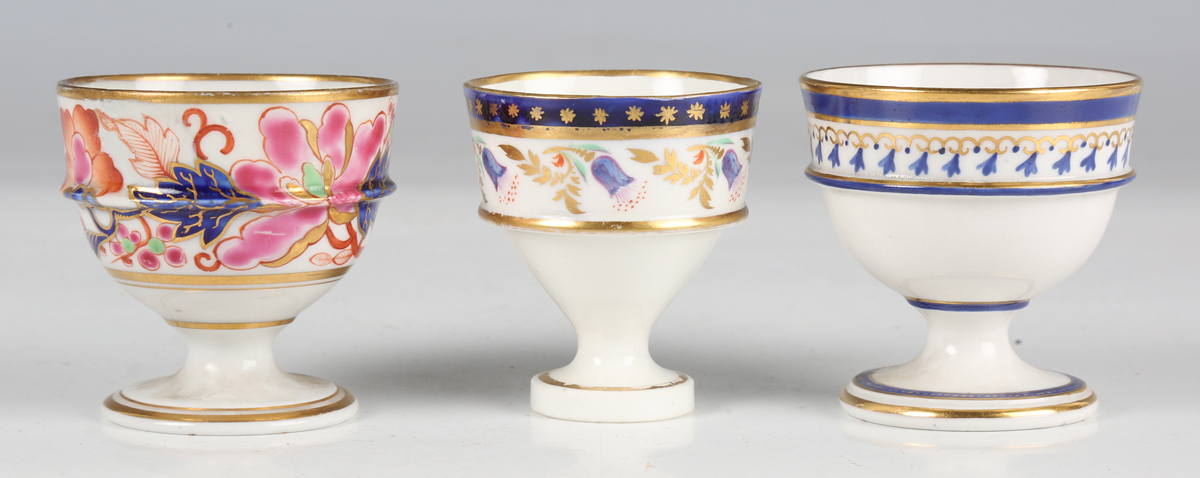 Three Barr, Flight & Barr Worcester eggcups, early 19th century, two with large circular foot and horizontal rib to the body, the first painted in Japan colours with flowers, the second in blue and gilt with a band of stylized flowers, impressed mark to base, the third with smaller foot and bowl painted and gilt with bellflowers, each 5cm high (some restoration). Provenance: The Flight Collection.