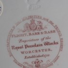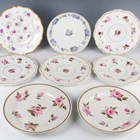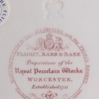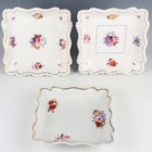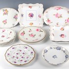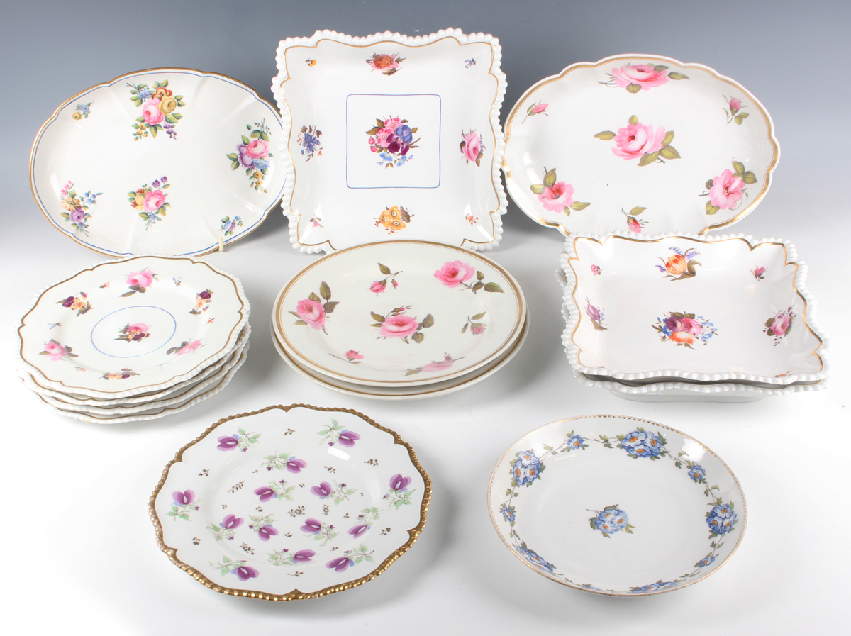 Three Flight, Barr & Barr Worcester square shaped dishes, early 19th century, each with gilt lined gadrooned rim painted with various scattered flowers, sprigs and bouquets, impressed and puce printed marks to bases, all 23.5cm square, together with a group of similarly painted Flight & Barr Worcester, including four plates, diameter 22cm, an oval dish with pink roses, length 28.5cm, two matching plates and an unusual Flight, Barr & Barr oval dish painted in Sèvres style, pseudo blue painted Sèvres mark to base, length 27.5cm (faults and restoration). Provenance: The Flight Collection.
