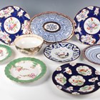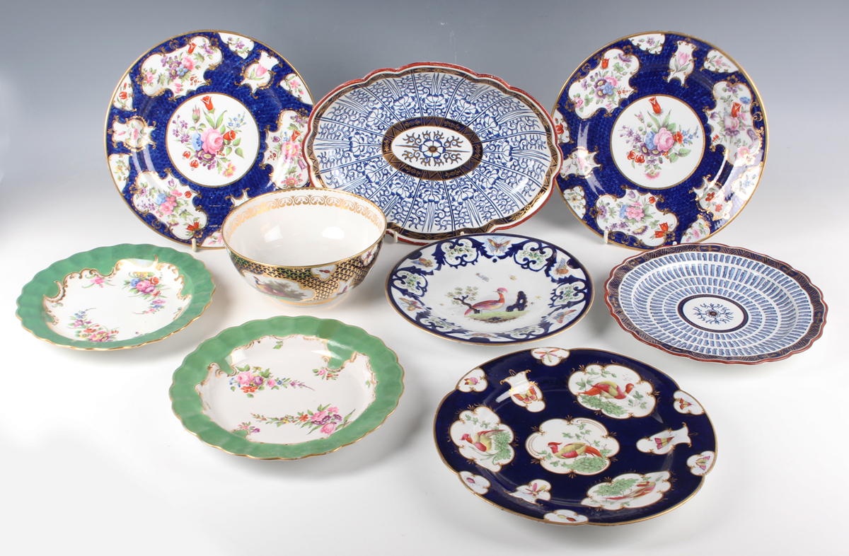 A Barr, Flight & Barr Worcester slop bowl, early 19th century, the cobalt blue exterior overlaid with a gilt scale pattern and reserved with a mixed range of shaped panels painted with butterflies, insects and exotic or fancy birds, impressed mark to base, diameter 16.5cm, a matched pair of Barr, Flight & Barr blue scale ground plates painted with variously shaped floral panels, one with printed and impressed mark, the other a script and incised mark, diameter 23.8cm, and a small group of other Worcester wares, including a Music pattern plate, diameter 22cm, a Royal Lily pattern oval dish, length 28cm, and a pair of plates in the Marchioness of Huntley pattern, diameter 21cm, various marks to bases (faults and restoration). Provenance: The Flight Collection.