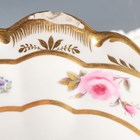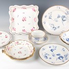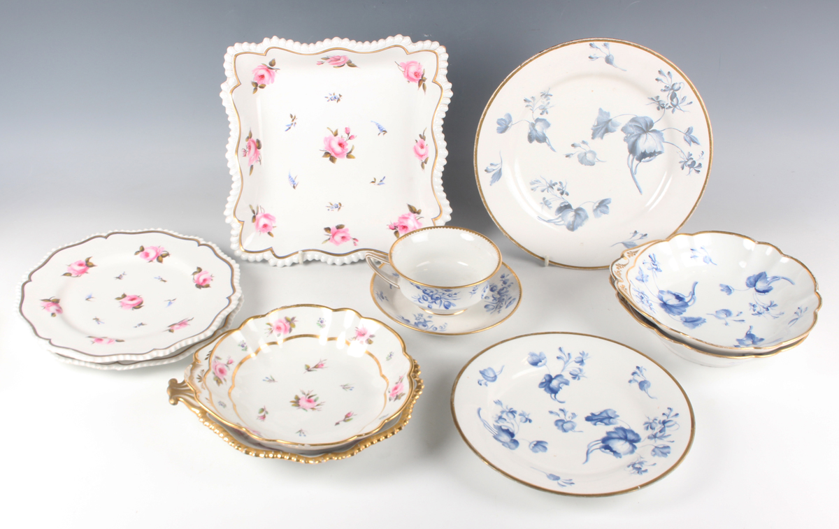 A Flight, Barr & Barr Worcester teacup and saucer, early 19th century, painted in blue monochrome with Dresden style flowers beneath a gilt dentil rim, impressed marks to bases, diameter of saucer 15cm, together with a small group of similarly painted Barr, Flight & Barr Worcester wares, comprising two shell shaped dishes and two plates, 21cm and 24cm diameter, and a group of Flight & Barr Worcester painted with scattered pink roses, including a square shaped dish with moulded gadrooned rim, 23.5cm square, a shell shaped dish and two plates, diameter 22cm, various impressed and puce printed marks to bases (faults and restoration). Provenance: The Flight Collection.