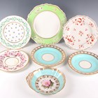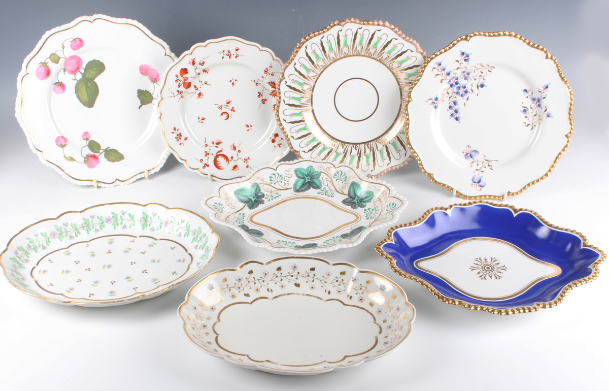 A mixed group of Flight & Barr Worcester tableware’s, early 19th century, including a gadrooned rim plate painted with strawberries, diameter 26cm, two gilt gadrooned rim plates, the first painted and gilt with bellflowers to the rim, the second with scattered blue, pink and gilt floral stems, diameter of both 25cm, a green rimmed plate painted in sepia with hops, diameter 27cm, a pair of plates painted in iron red and gilt with floral and berried sprigs, diameter 22.5cm, two oval dishes, length 29cm, and a diamond shaped dish painted and gilt with vine leaves, length 29.5cm, various impressed and printed marks (some faults and restoration). Provenance: The Flight Collection.