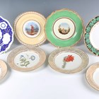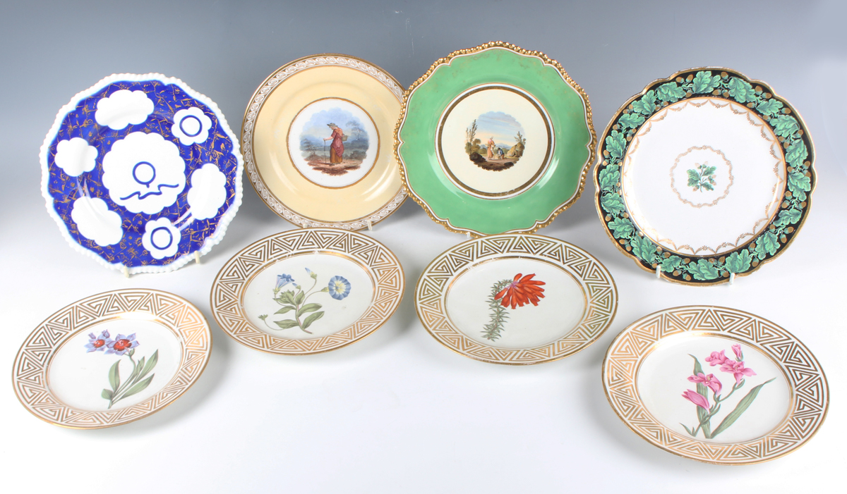 An unfinished Flight, Barr & Barr Worcester plate from the William IV service, circa 1830, with a central vacant cartouche and six smaller to the rim against an underglaze cobalt blue ground, within a gadrooned rim, with later gilt overlaid decoration, impressed mark to base, diameter 22cm, together with a Flight & Barr Worcester plate painted and gilt with a border of oak leaves and acorns to the black ground rim, unusual black painted mark to base, diameter 22.5cm, two other Flight, Barr & Barr Worcester plates painted with peasant figures, impressed and puce printed marks to bases, largest 22.3cm diameter, and a set of four Barr Worcester plates painted with botanical subjects within gilt key fret type rims, incised ‘B’ mark to bases, diameter 20.8cm (faults and restoration). Provenance: The Flight Collection.