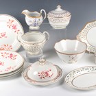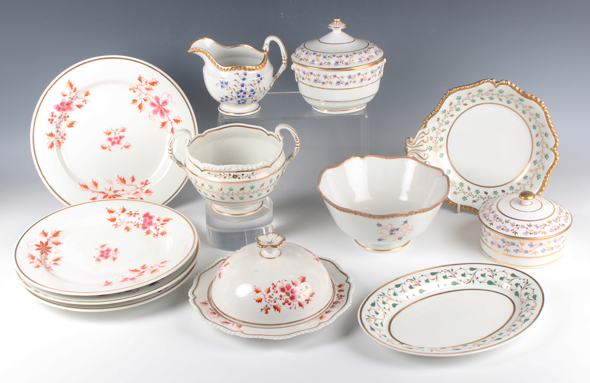 A mixed group of Flight & Barr Worcester tablewares, early 19th century, painted and gilt with an assortment of simplistic flower and foliage patterns, comprising a muffin dish and cover, diameter of dish 22cm, a jug, height 11.5cm, and matching bowl, diameter 19cm, with gilt gadrooned rims, an oval sucrier and cover with moulded circular handles, length 13.8cm, a matching cylindrical bowl and cover, diameter 12.3cm, a two-handled open sugar bowl and matching single-handled dish, an oval platter, length 26cm, and four plates (some faults and restoration). Provenance: The Flight Collection.
