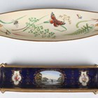 A Flight, Barr & Barr Worcester rectangular pen tray, early 19th century, painted with an oval topographical named view from Killykeen Cottage, Lough Erne, County of Cavan, Ireland, within a gilt foliate scroll frame against a cobalt blue ground, flanked by two smaller floral panels, the rims gilt lined, puce painted mark to base, length 25cm (rivet repaired), together with a similar Flight, Barr & Barr oval tray painted with butterflies, insects, ferns and wild grasses against a cream ground, flanked by swan handles, impressed mark to base, length 32cm. Provenance: The Flight Collection.