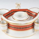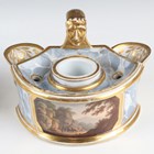 A Barr Flight & Barr Worcester inkstand, circa 1804-13, of hemispherical form, painted with a figure and two cows in a mountainous landscape within a grey pseudo marbled ground, the central well surrounded by three pen holders, the gilt loop handle with mask terminal flanked by two dip wells, puce painted marks to base, height 8cm, together with a similar Barr Worcester inkstand and well with orange, black and gilt decoration, incised mark to base, height 6cm (minor faults and restoration). Provenance: The Flight Collection.
