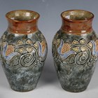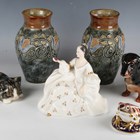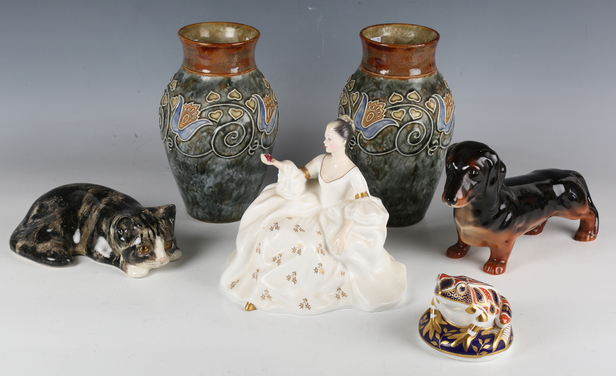 A pair of Royal Doulton stoneware vases, early 20th century, decorated by Florrie Jones, monogrammed, with a wide band of scrolling Art Nouveau style flowers and foliage against a mottled green ground, brown glazed necks, impressed and incised marks to bases, height 20cm, together with a Winstanley kitten, size 7, Royal Crown Derby Imari frog paperweight, Beswick dachshund and a Royal Doulton figure My Love, HN2339.