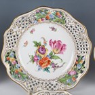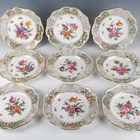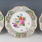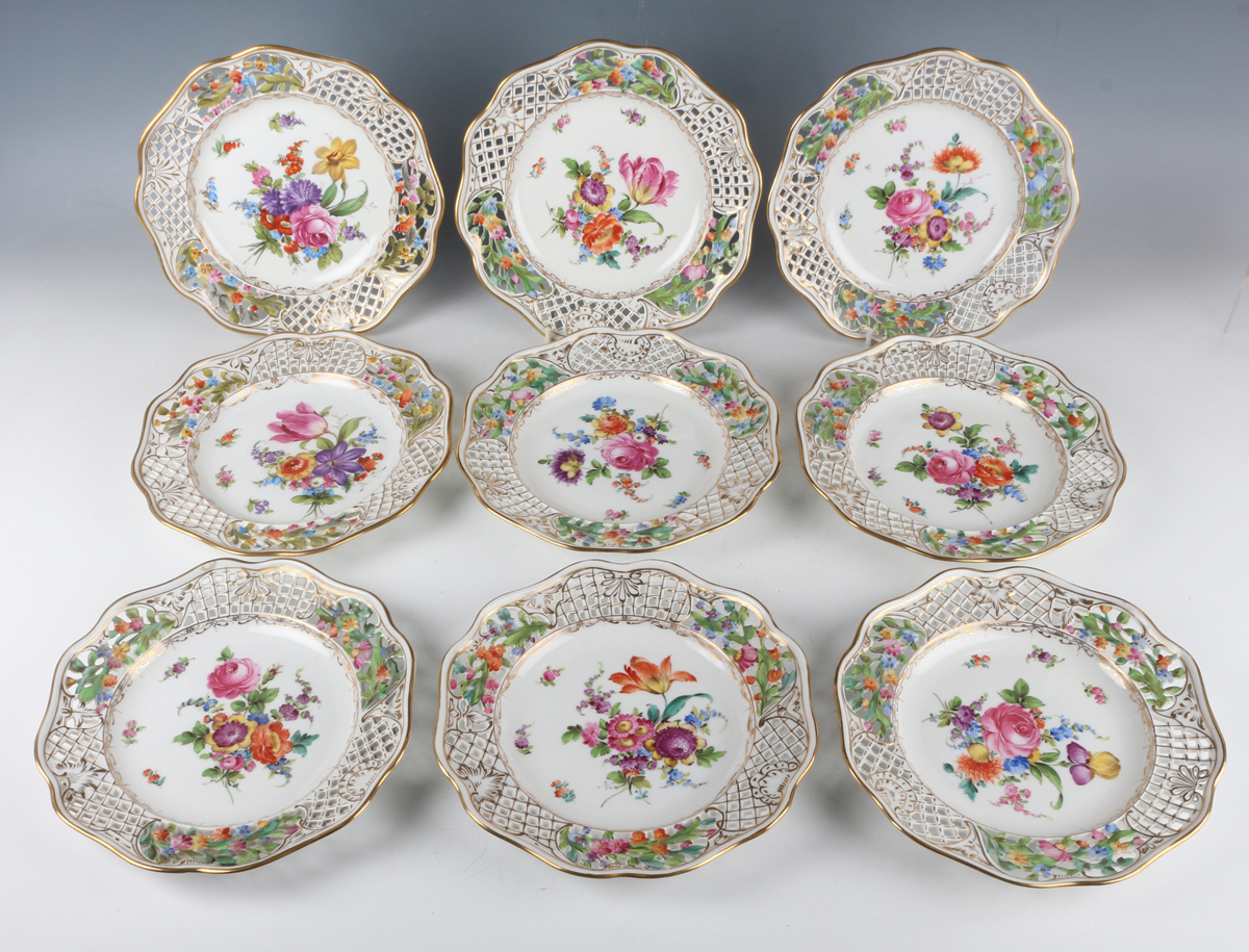 A set of twelve Dresden porcelain Meissen style cabinet plates, early 20th Century, painted with floral bouquets within pierced gilt enriched trellis rims each detailed with three pierced floral panels, blue printed and painted marks to bases, diameter 21.7cm.