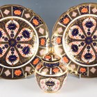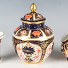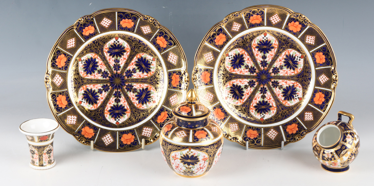 Four pieces of Royal Crown Derby decorated in Japan pattern 1128, comprising a pair of plates, dated 1918, diameter 23cm, a vase and cover, dated 1924, height 12cm, and a small flared cylindrical vase, dated 1975, height 6.5cm, together with a similar Royal Crown Derby small scuttle shaped posy holder decorated in pattern 6299, height 8.5cm, various red printed and painted marks to bases.