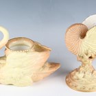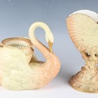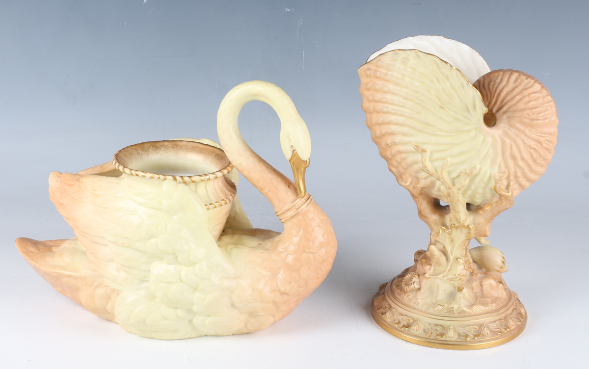 A Royal Worcester blush ivory glazed swan planter, dated 1903, modelled as a swan supporting a basketweave moulded pot between its wings, green printed mark to base, model No. 532, height 19cm, together with a Royal Worcester blush ivory shell vase on coral stem and circular foot, puce printed marks to base, height 21cm.