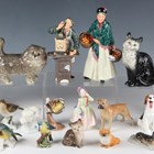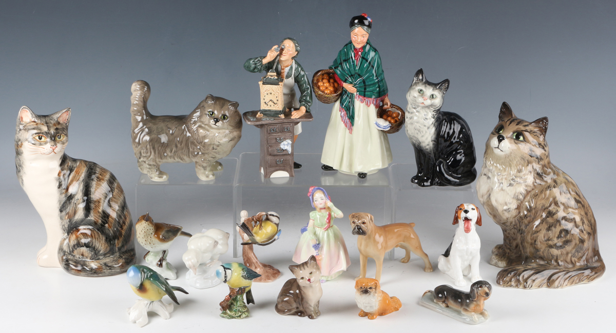 Three Royal Doulton figures, comprising The Clockmaker, HN2279, The Orange Lady, HN1953, and Babie, HN1679, together with a mixed group of pottery and porcelain animal models, including a Beswick cat, model No. 1867, three other Beswick cats, Babbacombe cat, height 21.5cm, three Branksome dogs, a Karl Ens blue tit and a Royal Doulton dog, HN1099.