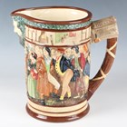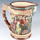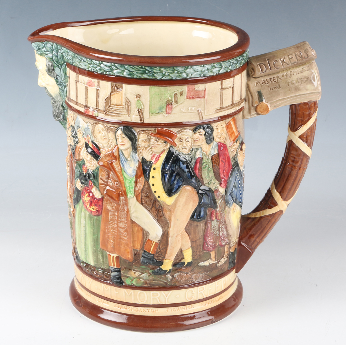 A Royal Doulton limited edition Master of Smiles and Tears Dickens Jug, No. 690 of 1000, designed by Noke, green printed and painted marks to base, height 27cm.