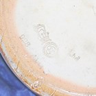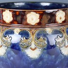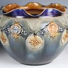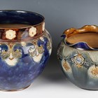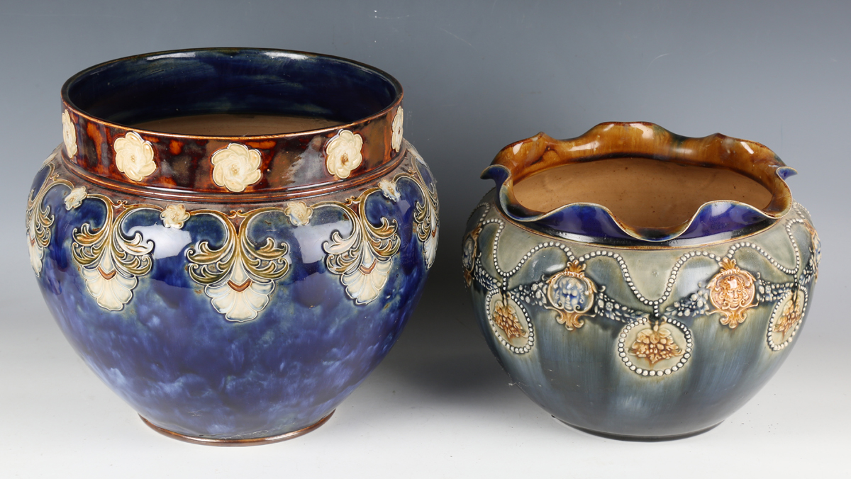 Two Royal Doulton stoneware jardinières, early 20th century, the first decorated with stylized flowers against a blue ground beneath a brown glazed neck rim with floral medallions, height 25cm, the second with mask medallions and pendant foliate panels on beaded garlands against a green ground beneath a wavy rim, height 19.5cm, impressed and incised marks to bases (minor faults).