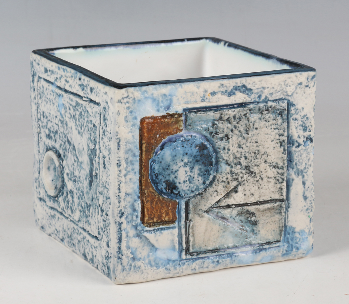A Newlyn Troika Cube Vase, 1970-83, with blue wash and typical abstract relief decoration, black painted mark to base, height 8cm.