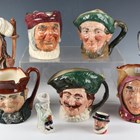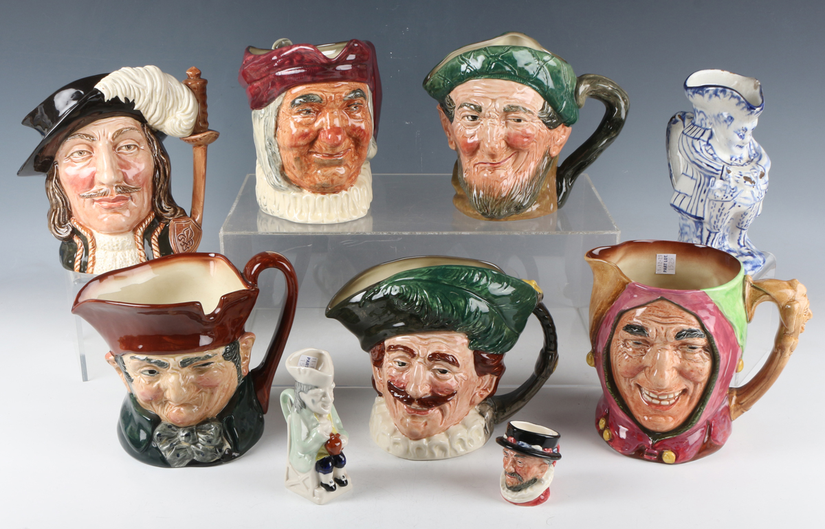 Six large Royal Doulton character jugs, comprising Auld Mac, Simon the Cellarer, Athos, Old Charley, The Cavalier and Touchstone, together with a miniature Royal Doulton Beefeater character jug, height 6cm, a Kevin Francis guild issue toby jug, height 11cm, and a 19th century pottery Toby jug with blue painted decoration, height 17.5cm (minor faults to blue painted Toby).