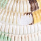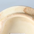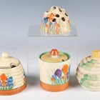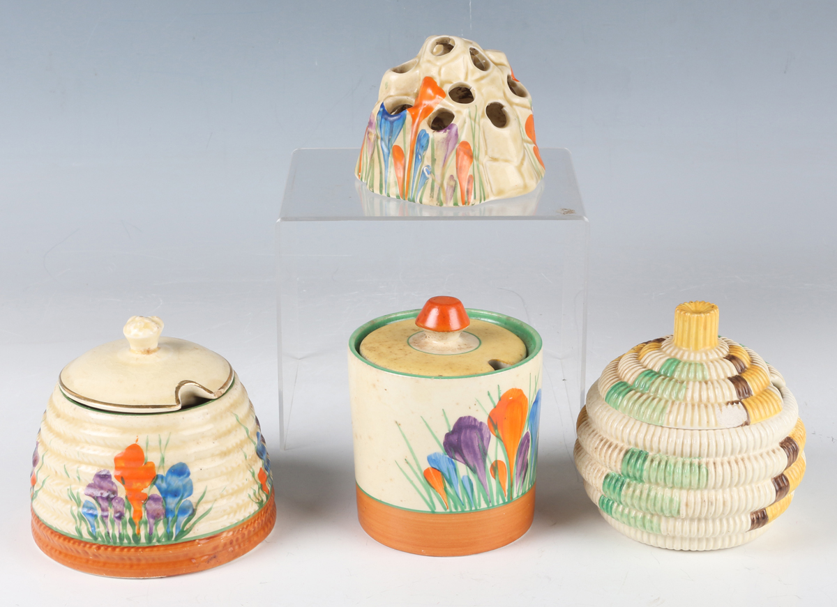 An Art Deco Clarice Cliff Bizarre Autumn Crocus pattern honey pot of skep shape, with matched cover, together with a similar cylindrical example with matched cover, a Clarice Cliff Bizarre Raffia pattern preserve jar and cover and an Autumn Crocus pattern flower frog, shape No. 225, height 6cm (faults).