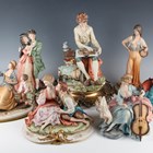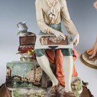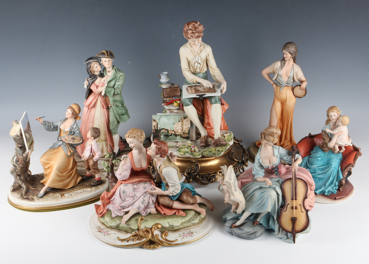 An Italian Capodimonte Triade bisque porcelain figure of an artist, by Benacchio, raised on a gilt metal base, height 36cm, together with five Capodimonte figures by Merli, including a standing female figure titled Gipsy, height 30cm, and another similar group of a seated couple, various painted, impressed and incised factory marks (minor faults and repairs).
